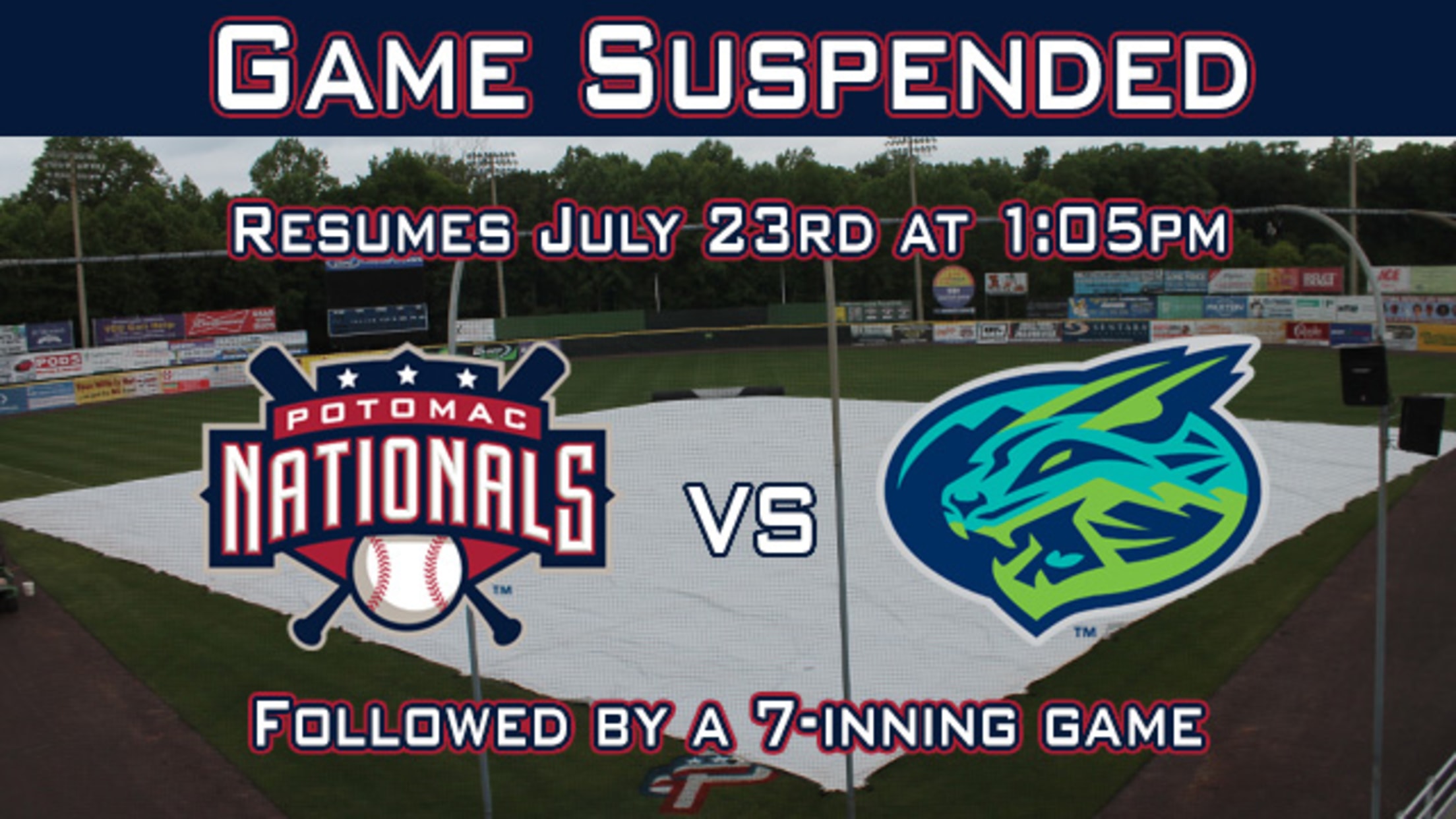 First pitch of the suspended game will begin at 1:05 pm. The regularly scheduled game will begin 30 minutes after the completion of Saturday's game. Coverage begins at 12:50 pm with the P-Nats Leadoff Show on the Potomac Nationals Baseball Network. The broadcast can be streamed live on potomacnationals.com or through the TuneIn Radio or MiLB First Pitch apps!