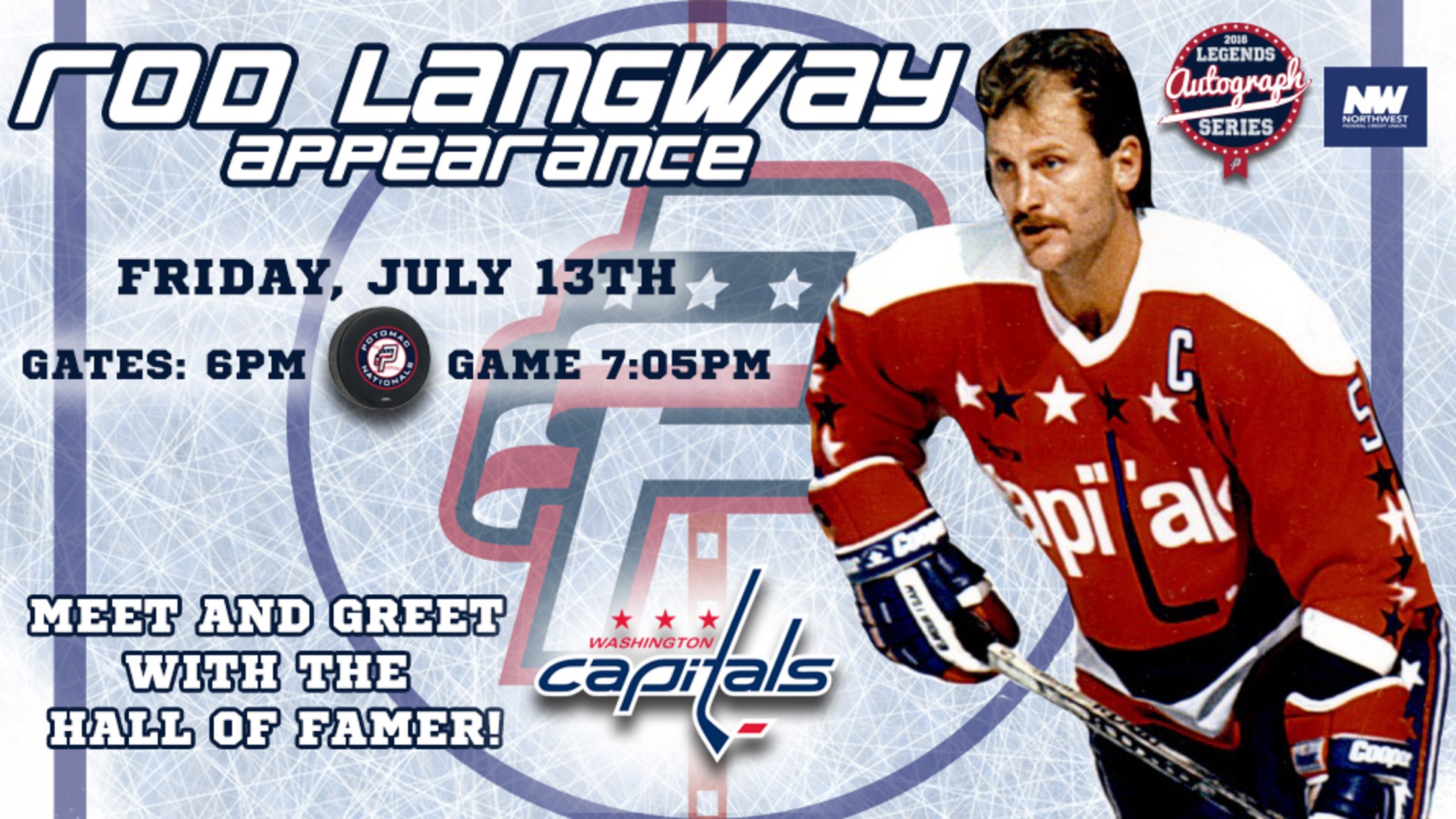Rod Langway, now part of the eight event Legends Autograph Series, presented by Northwest Federal Credit Union, will hold a meet and great autograph session on Washington Capitals Night at Northwest Federal Field at Pfitzner Stadium. All autograph signings are free, and will be available for fans on a first-come, first-served basis. The autograph session will begin as soon as gates are open for Friday's game. Rod Langway will also throw out a first pitch prior to the game.