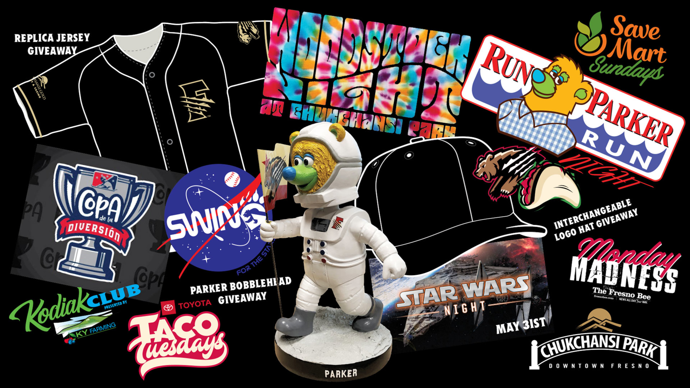 · May 31: Star Wars Night, presented by Noble Credit Union, featuring movie-quality characters throughout Chukchansi Park, Star Wars-themed uniforms on the field and a Star Wars-themed fireworks show. (Game-worn jerseys available for bid.)