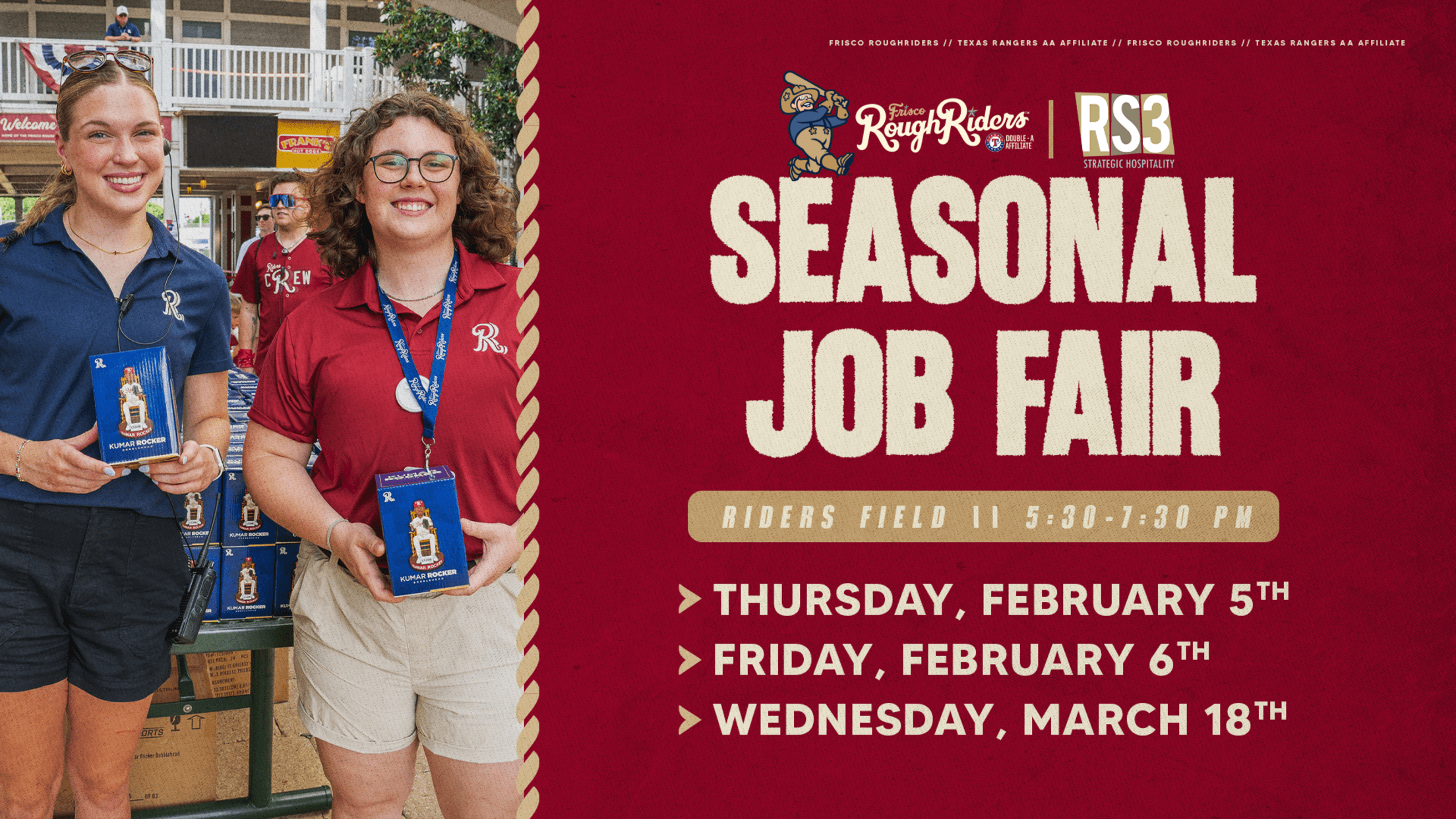FRISCO, Texas (February 2, 2026) - The RoughRiders are holding three Seasonal Job Fairs on Thursday, February 5th; Friday, February 6th and Wednesday, March 18th. For more information, click here. RoughRiders positions available include: - Ushers - Ticket Scanners - Kids Zone Attendants - Lazy River Attendants (CPR certification required)