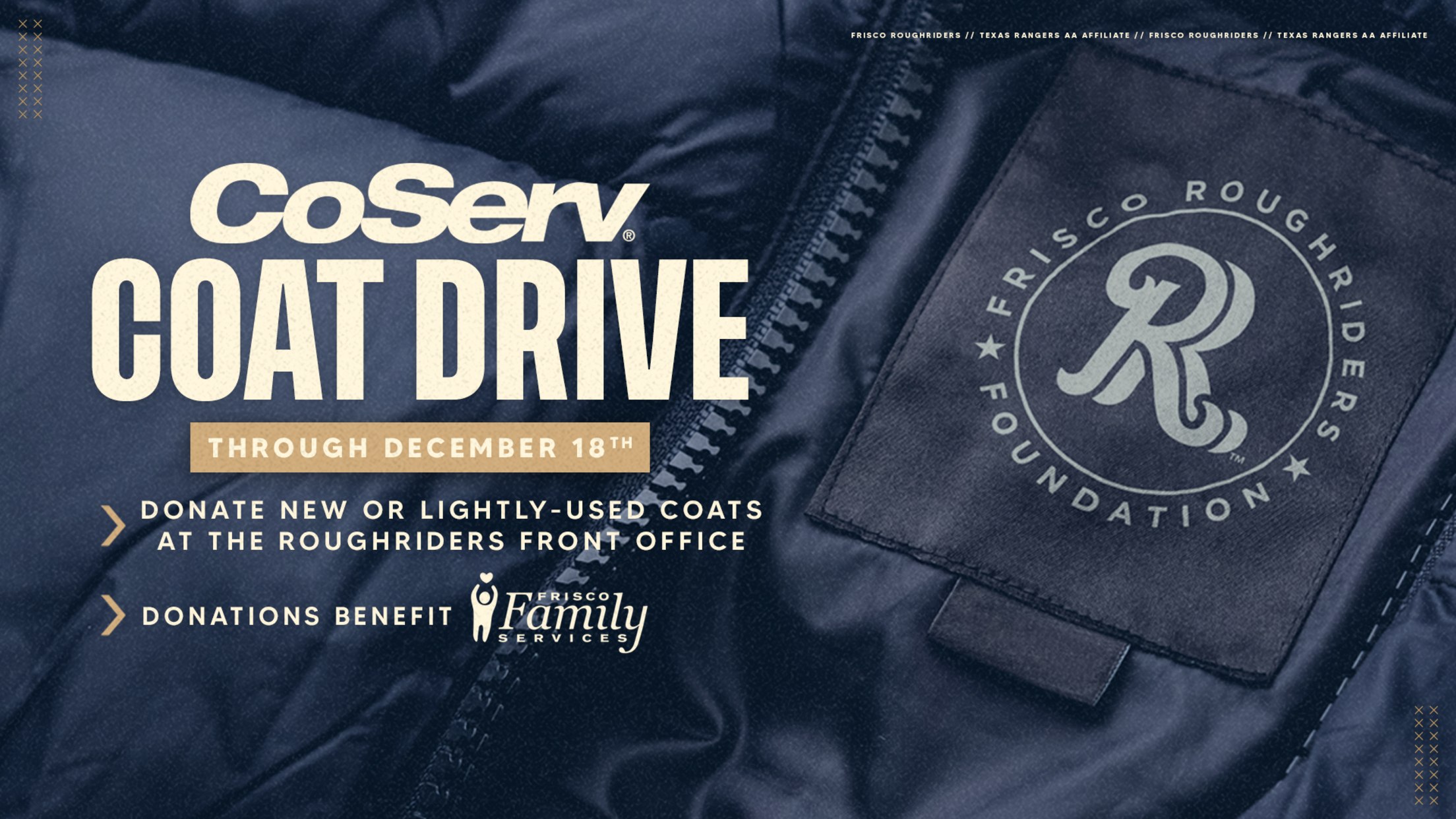 FRISCO, Texas (December 2, 2024) – The Frisco RoughRiders will host the CoServ Coat Drive at Riders Field from Monday, December 2nd through Wednesday, December 18th. The drive will benefit Frisco Family Services.