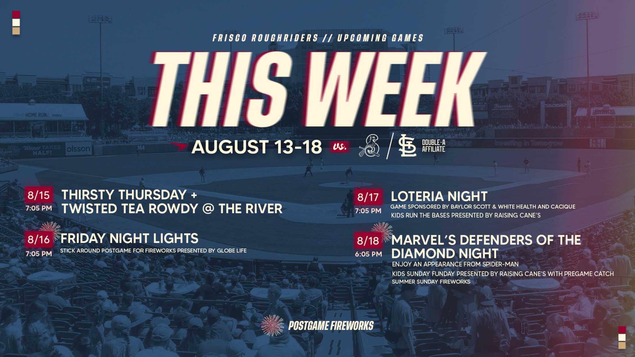 FRISCO, Texas (August 12 , 2024) – The Frisco RoughRiders, Double-A affiliate of the World Series champion Texas Rangers, host their tenth homestand of the season with a stacked week full of promotional events spanning from Tuesday, August 13th through Sunday, August 18th against the Cardinals-affiliated Springfield Cardinals.