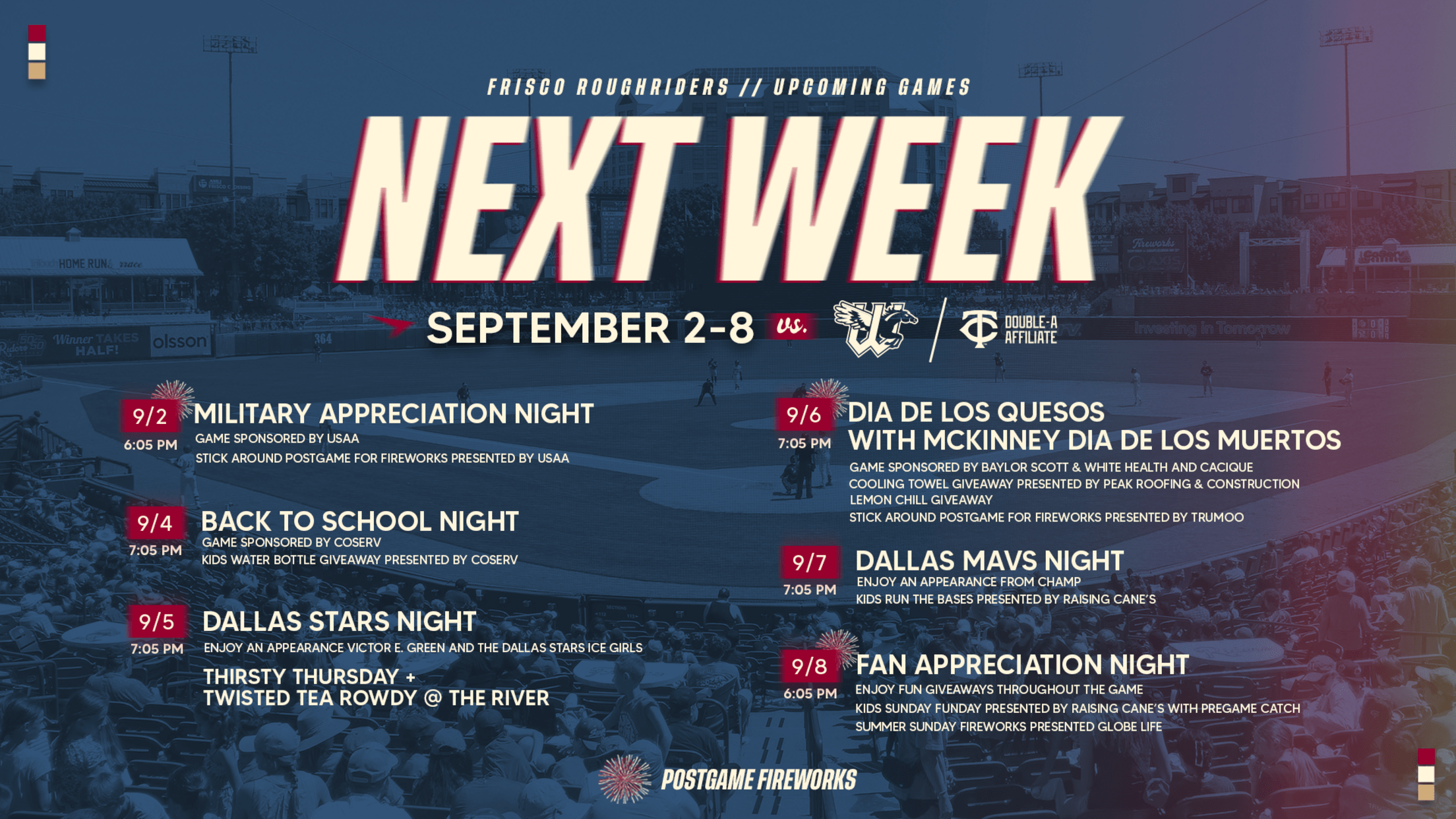 FRISCO, Texas (August 29, 2024) – The Frisco RoughRiders, Double-A affiliate of the World Series champion Texas Rangers, host their 12th and final homestand of the regular season with a stacked week full of promotional events spanning from Monday, September 2nd through Sunday, September 8th against the Twins-affiliated Wichita Wind