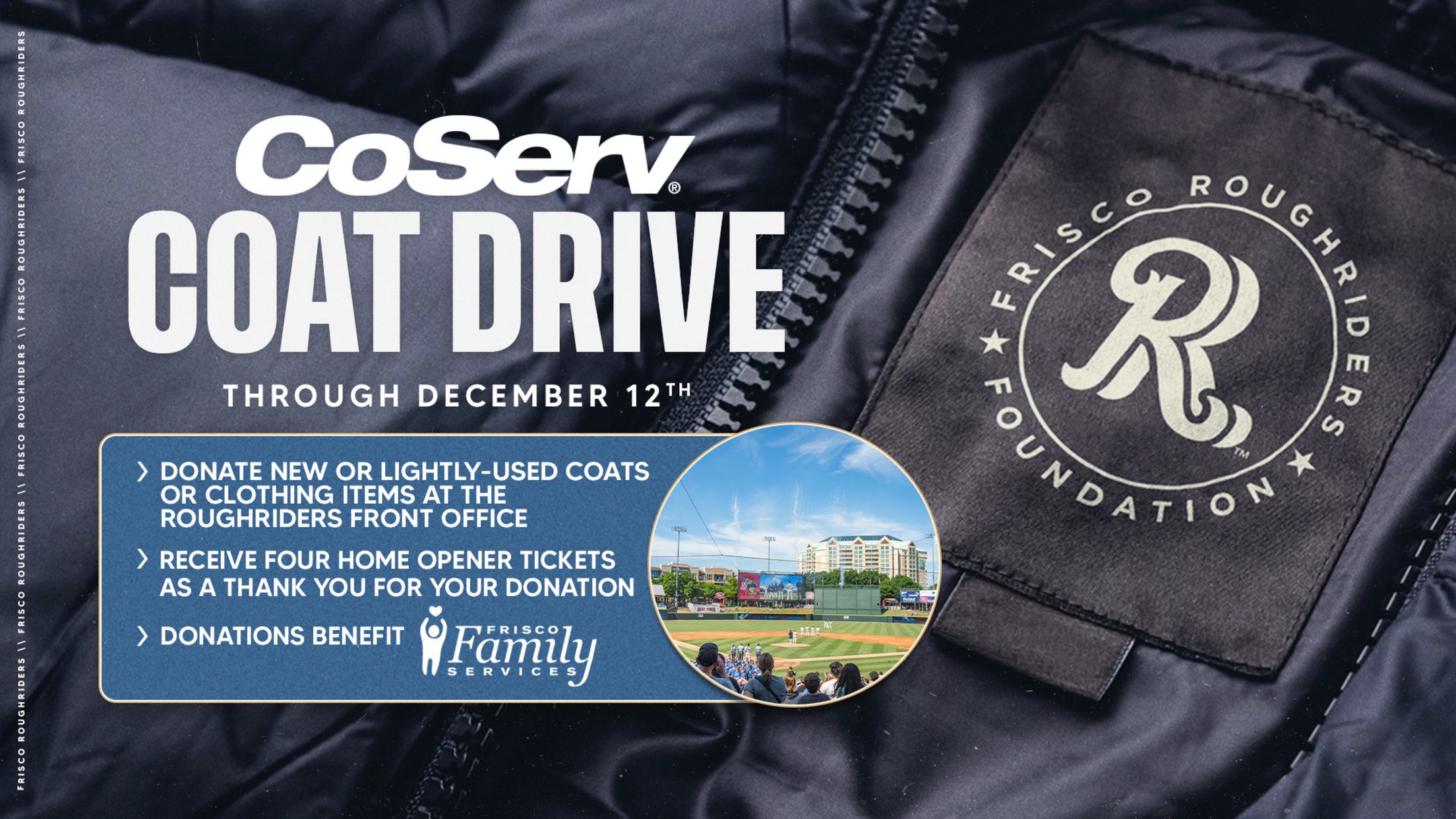 FRISCO, Texas (November 10, 2025) – The Frisco RoughRiders will host the CoServ Coat Drive at Riders Field from Monday, November 10th, through Friday, December 12th. The drive will benefit Frisco Family Services. Donors can drop off new or lightly used coats at the Frisco RoughRiders Administrative Office at the