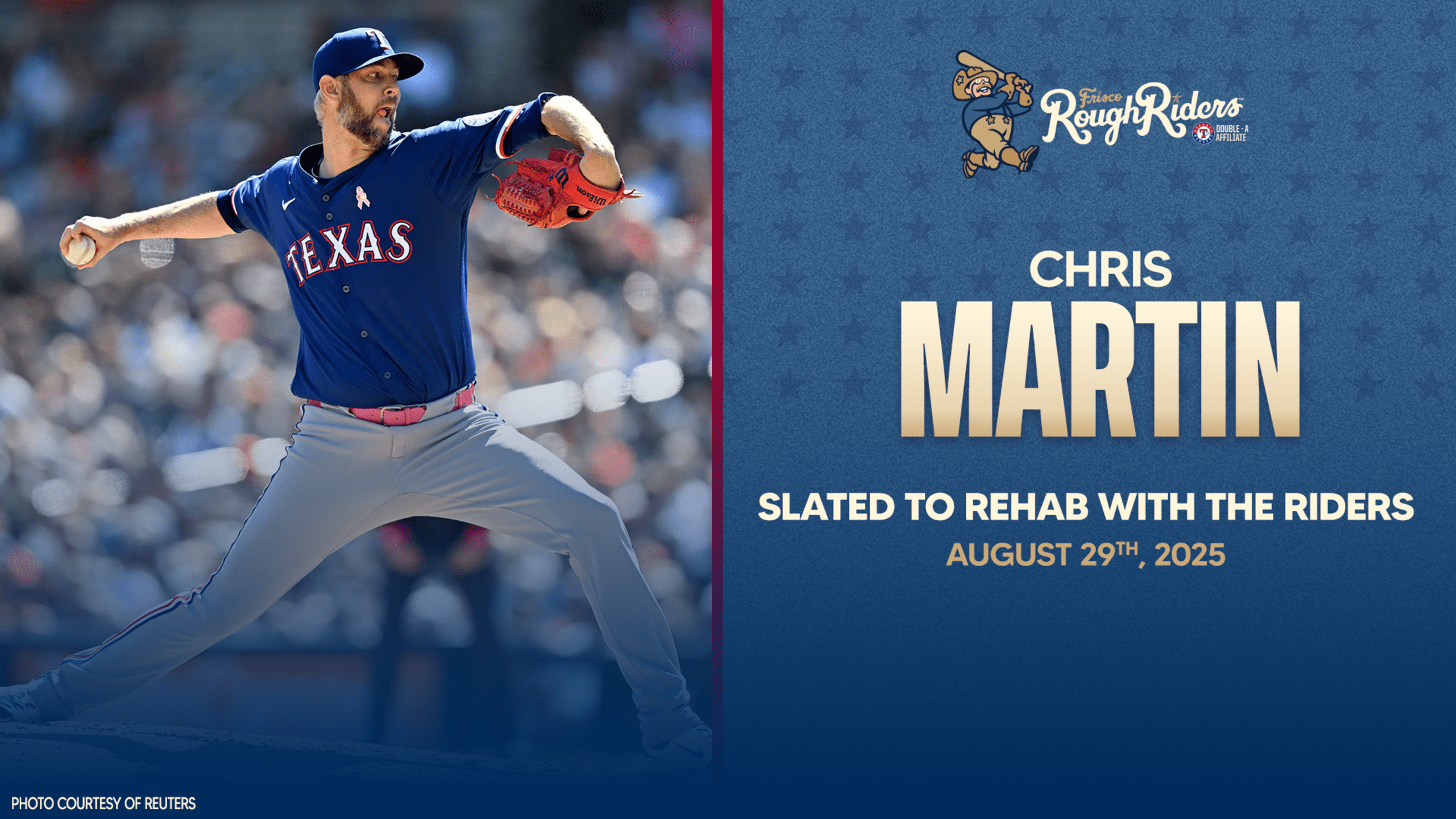 FRISCO, Texas (August 29, 2025) – Texas Rangers reliever Chris Martin is slated to begin his rehab assignment with the Frisco RoughRiders at 7:05 p.m. on Friday, August 29th, when the RoughRiders face the San Antonio Missions (Padres affiliate) from Riders Field.