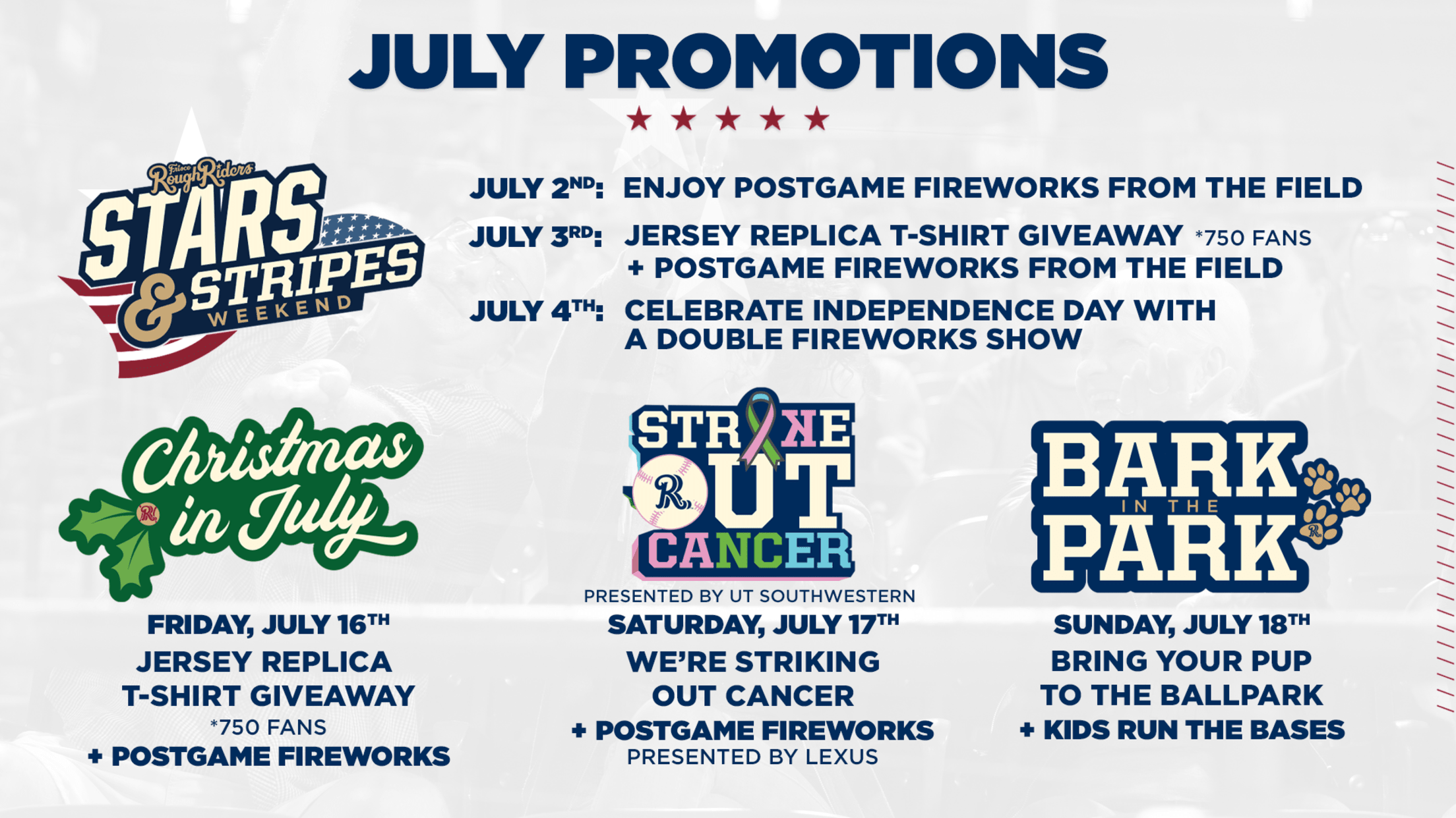 FRISCO, Texas (June 17, 2021)– Coming off the busiest home month of the season in June, the Frisco RoughRiders are thrilled to announce a massive July promotional schedule. Over the course of the month, Frisco will host 10 games at Riders Field!