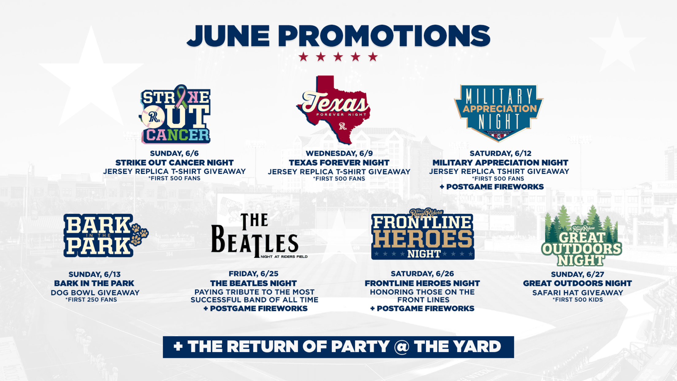 -Eric Nadel’s Tuesday Tunes – Hall of Fame broadcaster, Eric Nadel, has teamed up with the Riders to present some local live music at Riders Field this year. Every Tuesday night throughout the season, we will have a Texas musician performing live from 6:15 p.m. to 7:15 p.m. in The Roadhouse Pavilion next to the Riders Outpost team store. Beer specials in The Roadhouse will include $2 domestic and $3 craft beers from 6 p.m. to 8 p.m. Artists currently scheduled to perform include Ryan Berg, Vanessa Peters and Ginny Mac.