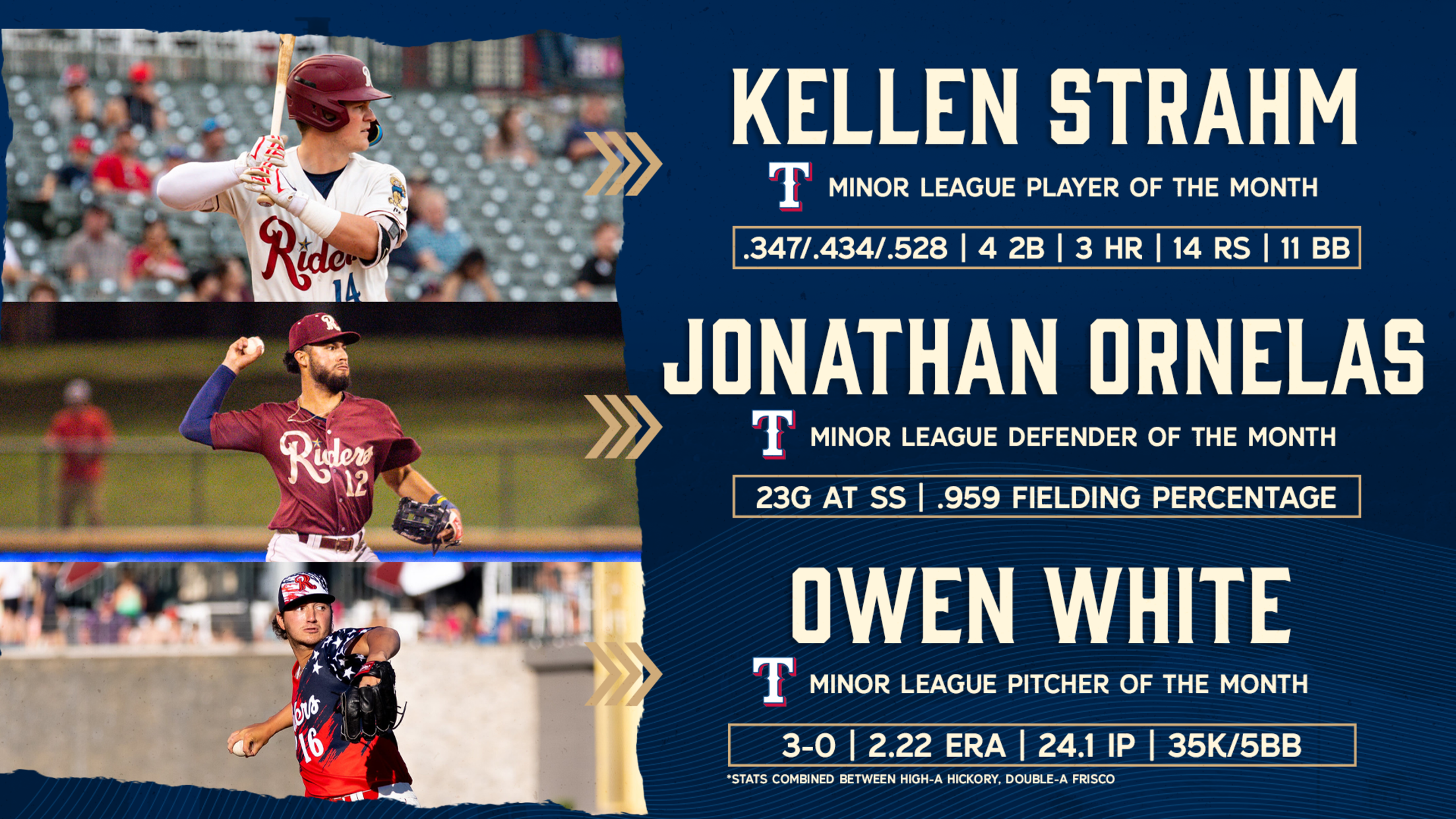 FRISCO, Texas (July 14, 2022) - The Texas Rangers announced on Thursday that three RoughRiders players won June honors for the Rangers Minor League system. Kellen Strahm captured Player of the Month honors while Owen White was named the Pitcher of the Month and Jonathan Ornelas the Defender of the