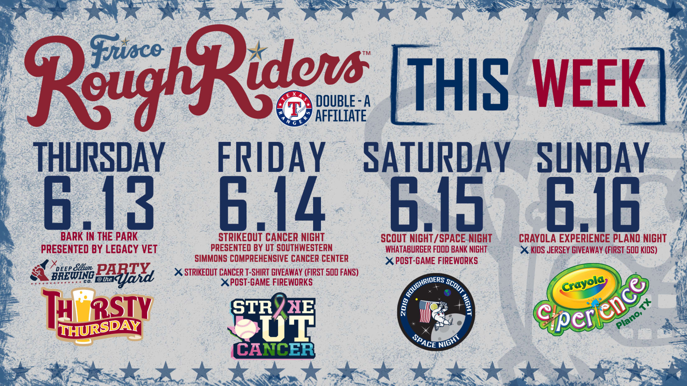 The big week at the ballpark concludes Sunday with Crayola Experience Plano Night, during which the first 500 kids 12 & younger will receive a free jersey that they can color themselves. It's also the latest Kids Sunday Funday, which features pregame catch on the field and free kids tickets for members of the Riders Kids Club.