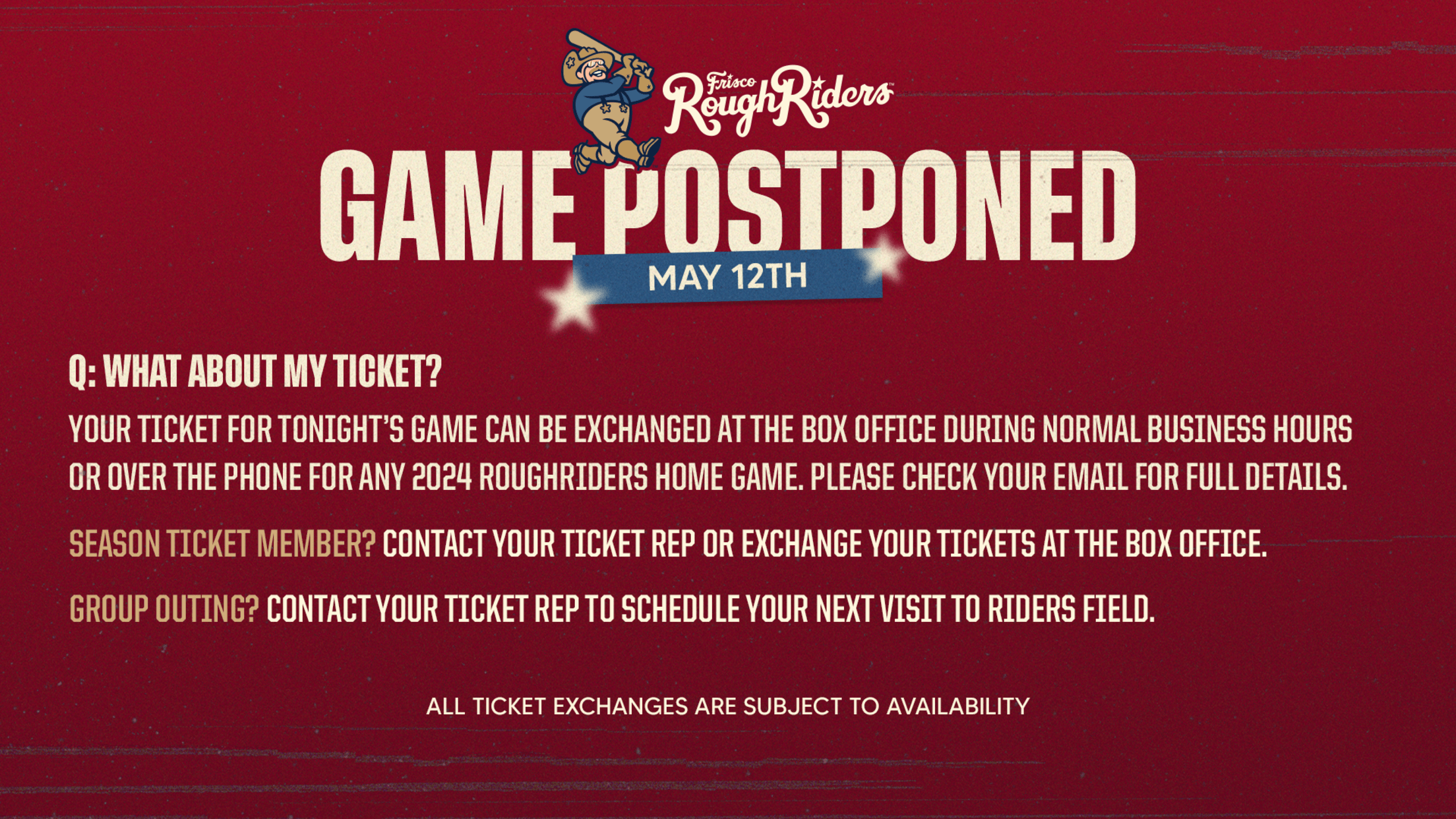 FRISCO, Texas (May 12, 2024) – Sunday's game between the Frisco RoughRiders and San Antonio Missions has been postponed due to inclement weather.