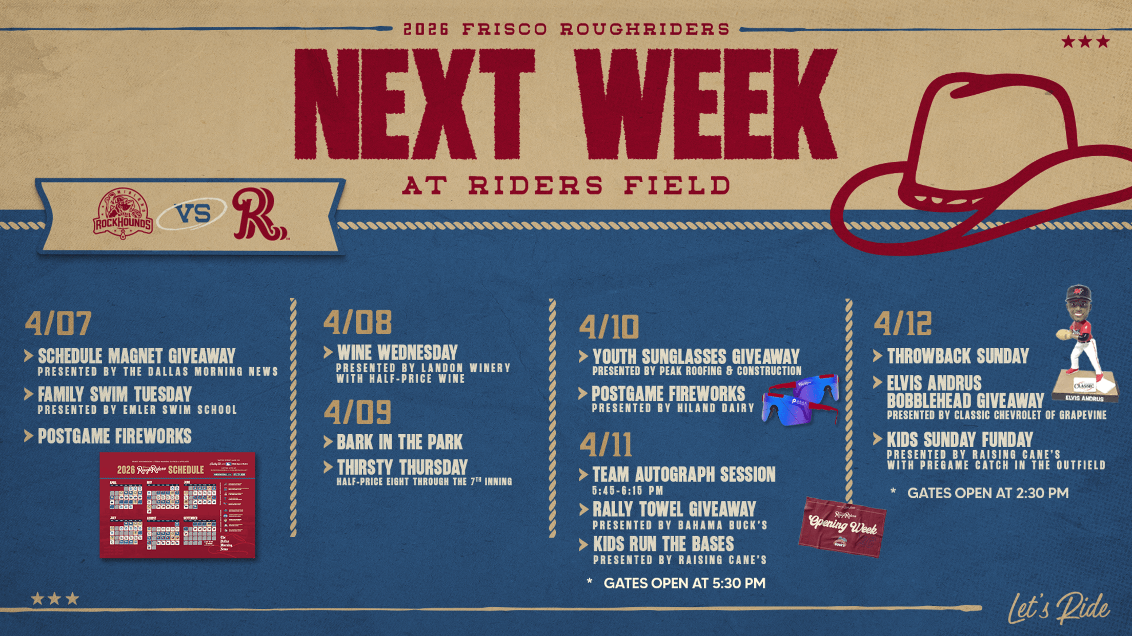 FRISCO, Texas (April 1, 2026) – After a long offseason, baseball returns to Riders Field April 7th through 12th for Opening Week. The six-game set features the RoughRiders and the Midland RockHounds, the Double-A affiliate of the Athletics. Special ticket offers are available for all Opening Week games by clicking here.