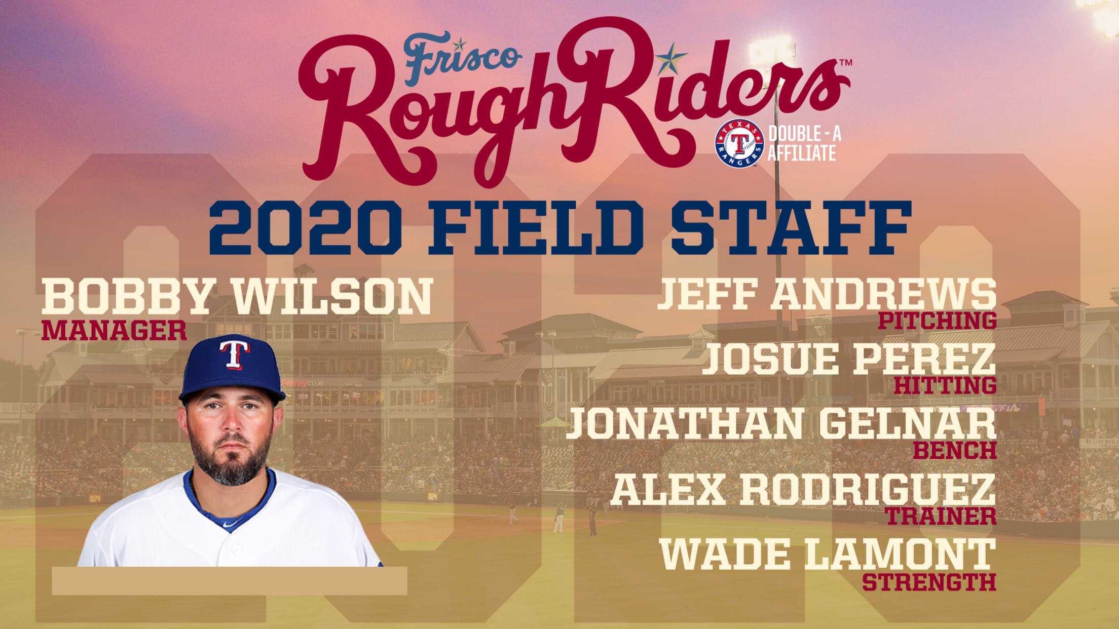 FRISCO, Texas (December 9, 2019) - On Monday, in conjunction with the Texas Rangers, the Frisco RoughRiders announced that former major league catcher Bobby Wilson will serve as the RoughRiders' ninth manager in franchise history for the 2020 season. Additionally, Wilson will be joined by Jeff Andrews (pitching coach), Josue Perez (hitting coach) and Jonathan Gelnar (assistant coach). Both Alex Rodriguez (athletic trainer) and Wade Lamont (strength and conditioning coach) return to the RoughRiders in 2020 as well after spending 2019 in Frisco.