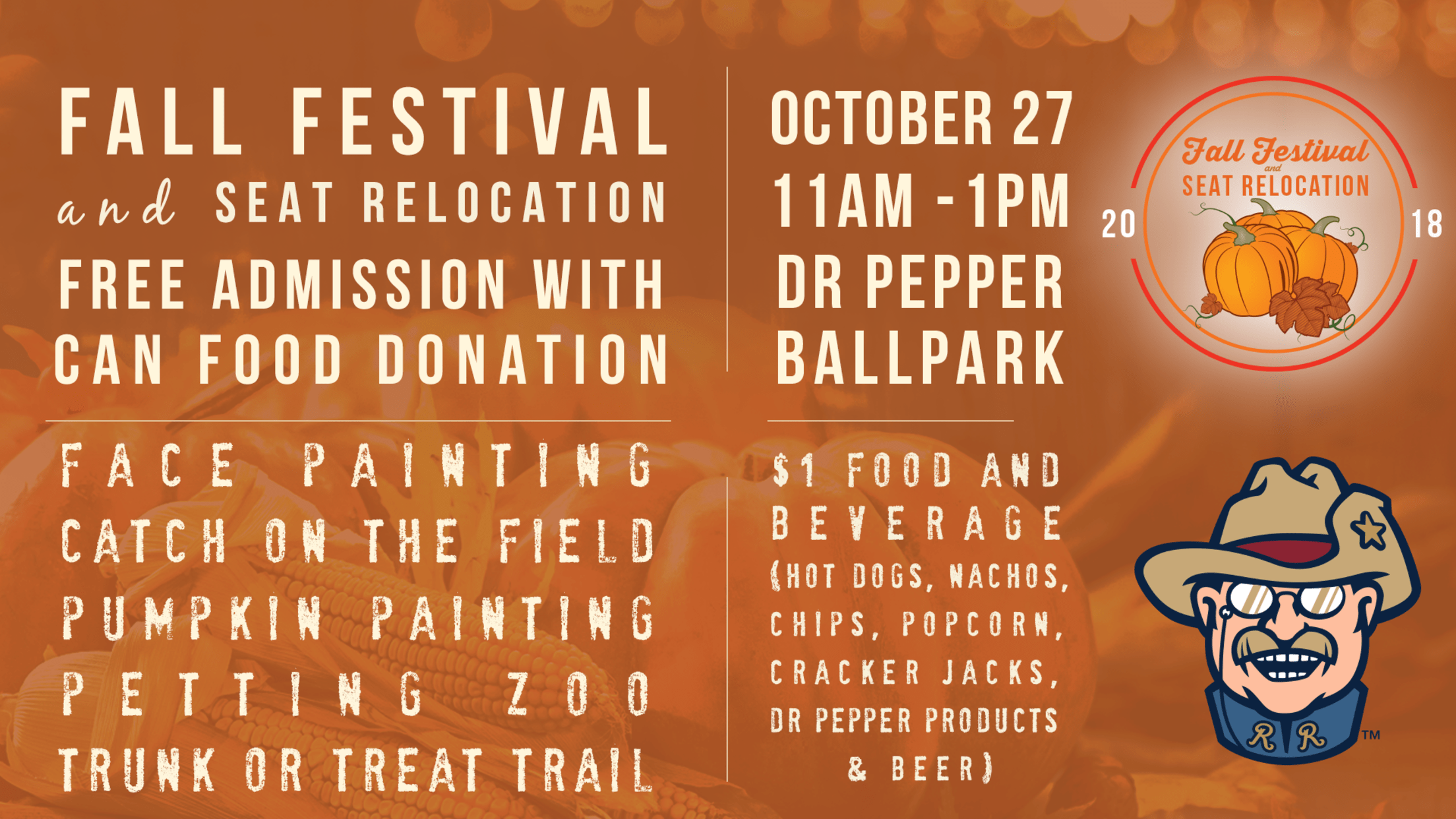 FRISCO, Texas (Oct. 1, 2018) -The Frisco RoughRiders are hosting their annual Fall Festival on Saturday, Oct. 27, from 11 a.m.-1 p.m. at Dr Pepper Ballpark. Admission is free with a donation of a canned food item to benefit North Texas Food Bank.