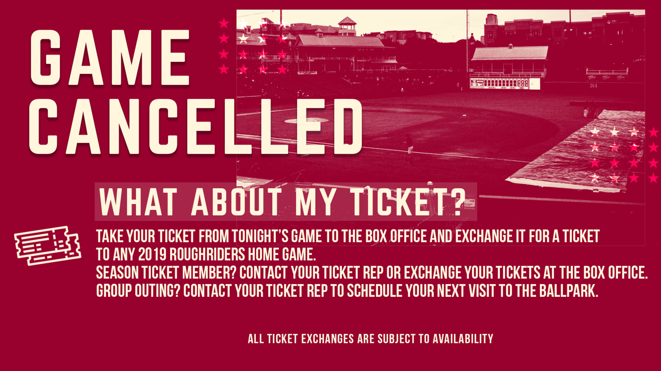 FRISCO, Texas (June 16, 2019) - Sunday's RoughRiders game has been cancelled due to inclement weather. It will not be made up.Fans with tickets to Sunday's game can exchange them for any remaining regular season home game in 2019. Exchanges can be made in-person at the Dr Pepper Ballpark box