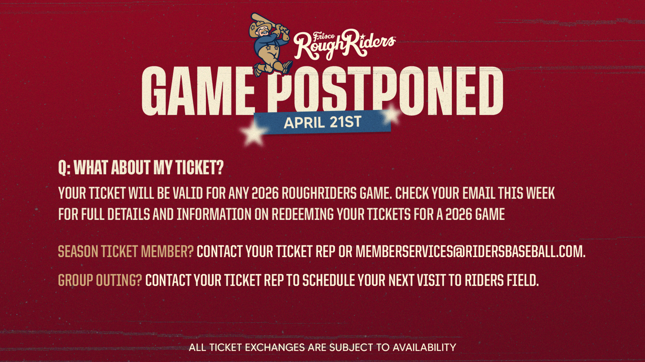 Fans can bring their ticket from Tuesday's game to the box office during normal business hours and exchange it for a ticket to any future 2026 RoughRiders home game. An email will be sent out with further details to all fans who had tickets for Tuesday's game. Ticket exchanges are based on availability and can be made over the phone or at the ballpark ticket office.