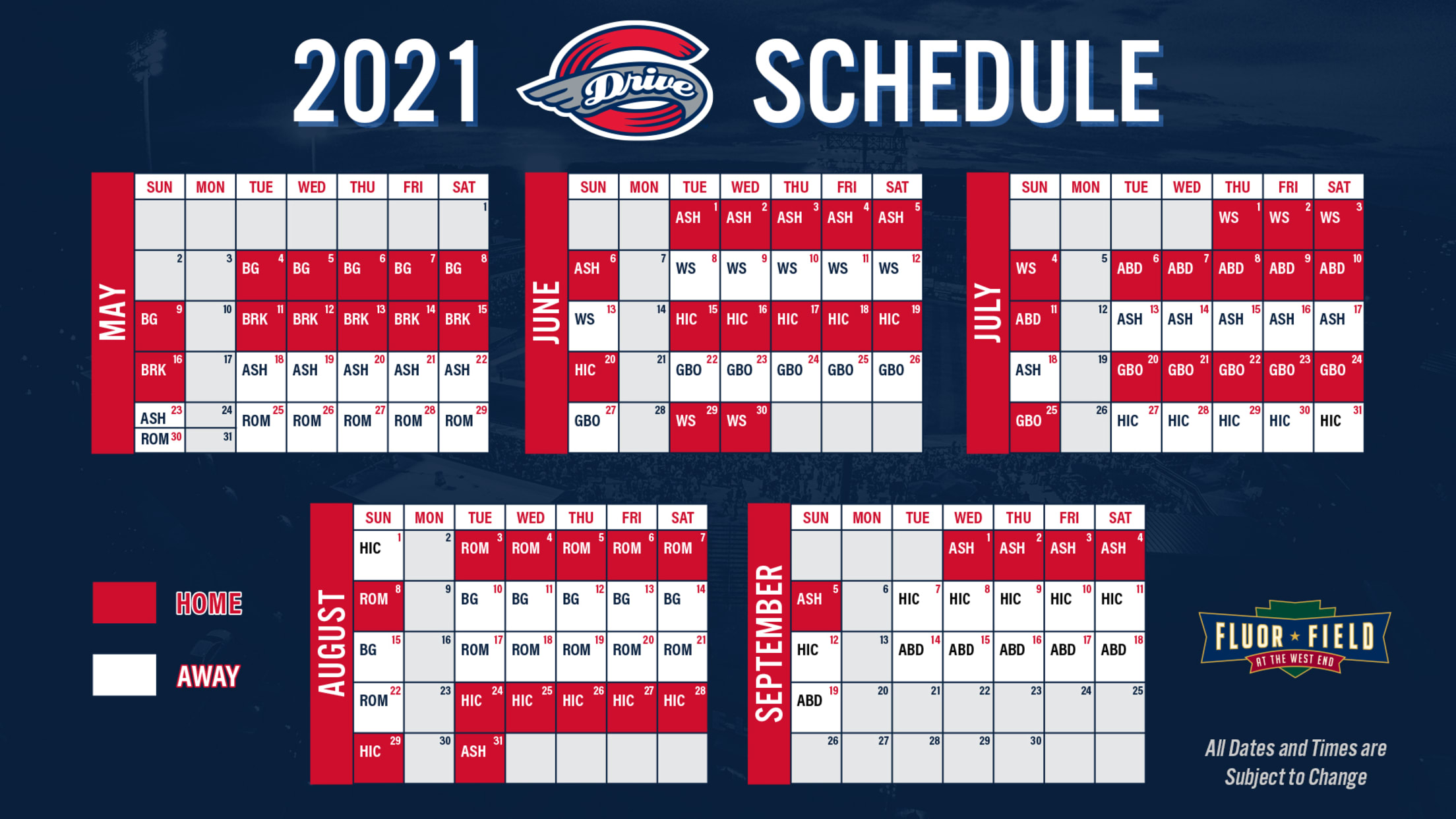 The Drive will be playing in the newly formed High-A East League, as members of the Southern Division. The 2021 season will feature a uniquely designed 120-game schedule, with an even balance of home and road games. The schedule for 2021 has been structured to minimize travel and allow for a focus on player health and safety.