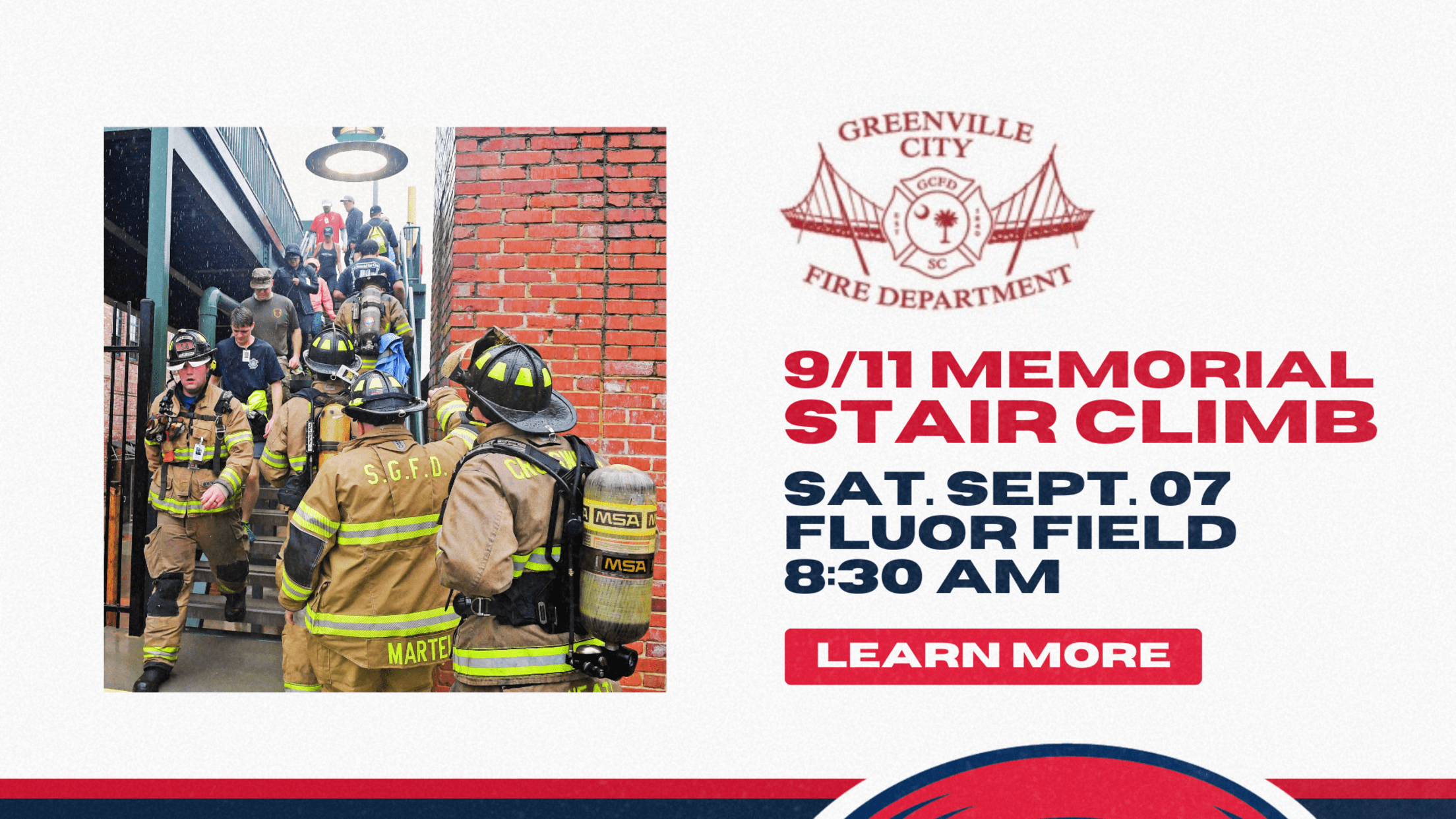 The Greenville City 9/11 Memorial Stair Climb, an annual event to commemorate and honor the FDNY firefighters and first responders who gave their lives on September 11, 2001, returns to Fluor Field on September 7th. Gates open at 6:30 AM and opening ceremonies will begin at 8:30 AM. This event
