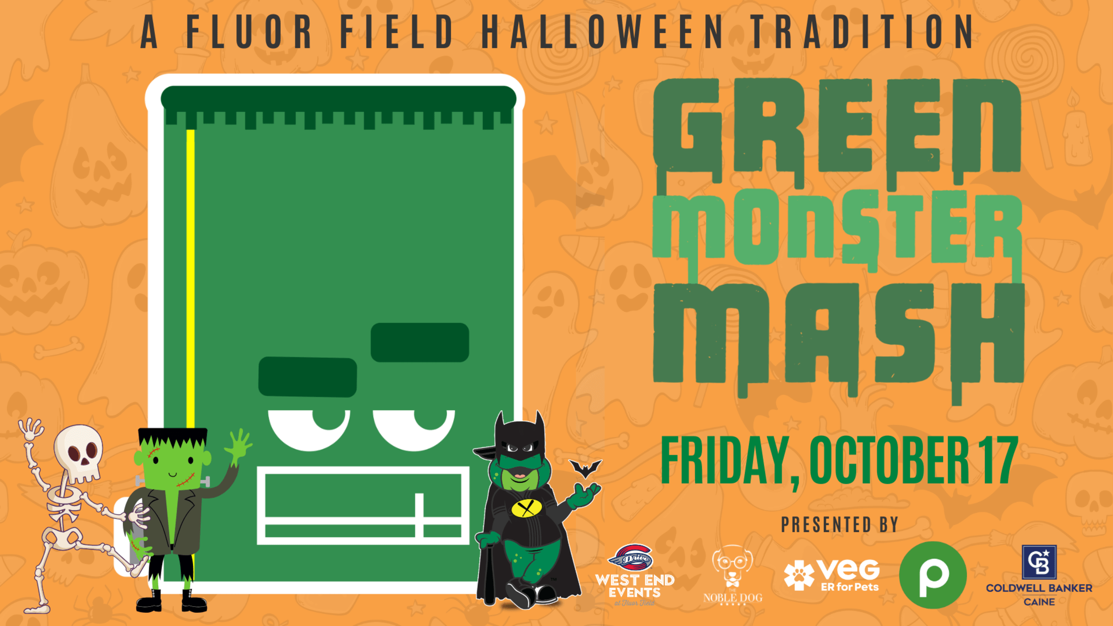 A Ghoulishly Good Time is Back at Fluor Field! Green Monster Mash at Fluor Field is back and better than ever with our partners Noble Dog Hotel and Publix for all the good boys and ghouls and dogs of Greenville! Friday, October 17, 4 PM – 8 PM Enjoy trick-or-treating
