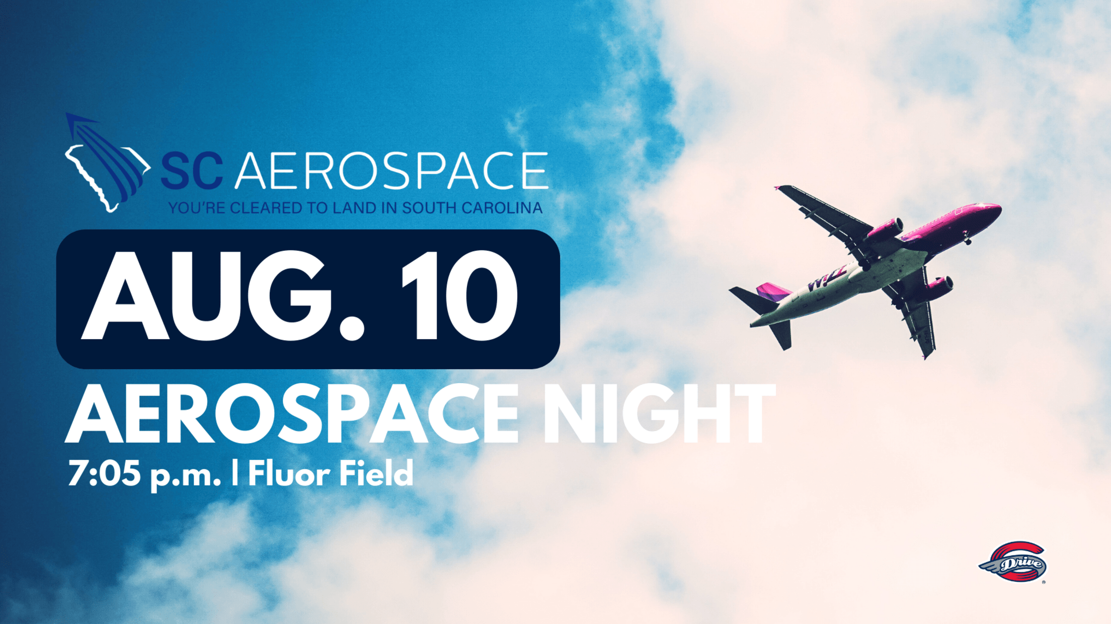 Greenville Drive vs. Greensboro Grasshoppers - Thursday, August 10 - 7:05 p.m. - Get Tickets The Greenville Drive and SC Aerospace team are thrilled to announce the third annual Aerospace Night at Fluor Field on Thursday, August 10th. This special event will shine a spotlight on the Aerospace industry, celebrating