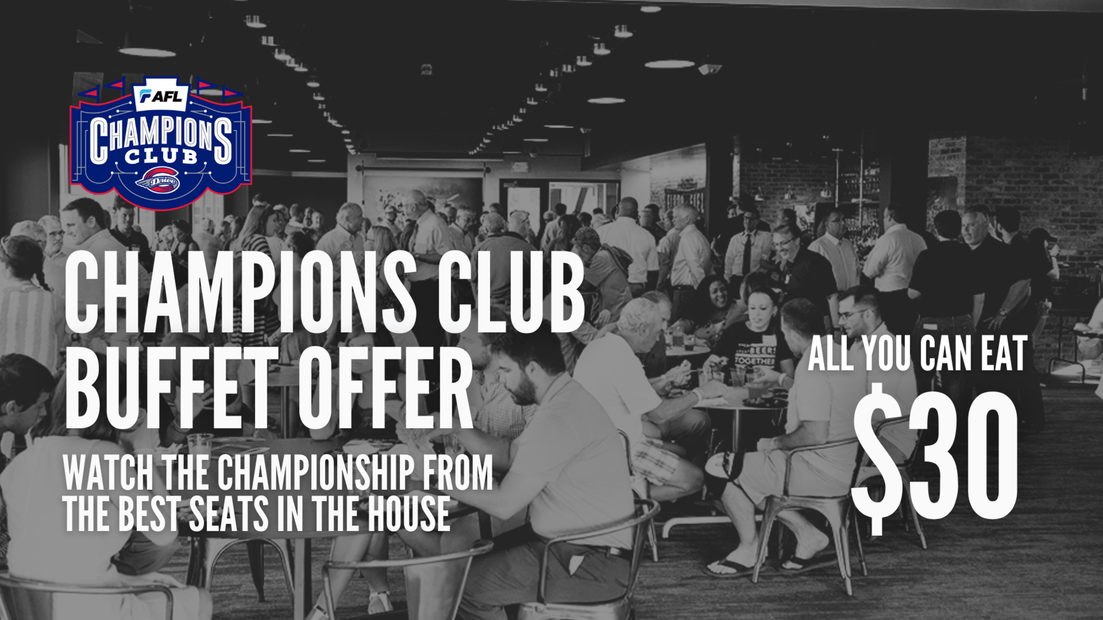 Enjoy the Championship Round games from the comfort of the best seat in the house and all the food you can eat for just $30! The AFL Champions Club is our private space for events, celebrations and more, but we're opening it up to celebrate in style as the Drive