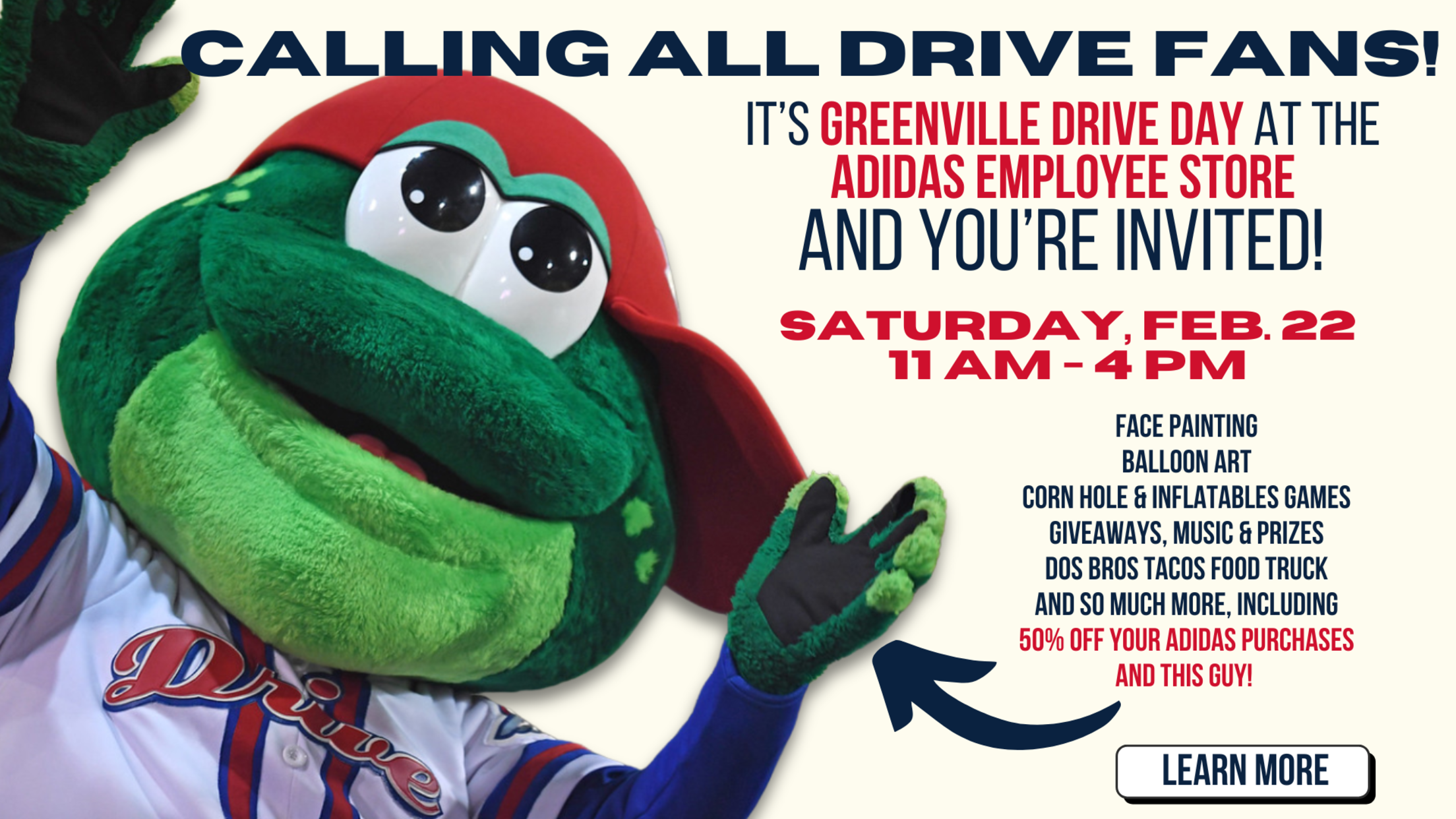 This Saturday, February 22, 11 AM – 4 PM, join the Greenville Drive at the adidas Employee Store located at 10 Quest Lane, Greenville, for an afternoon of family fun as we celebrate the quickly approaching baseball season!