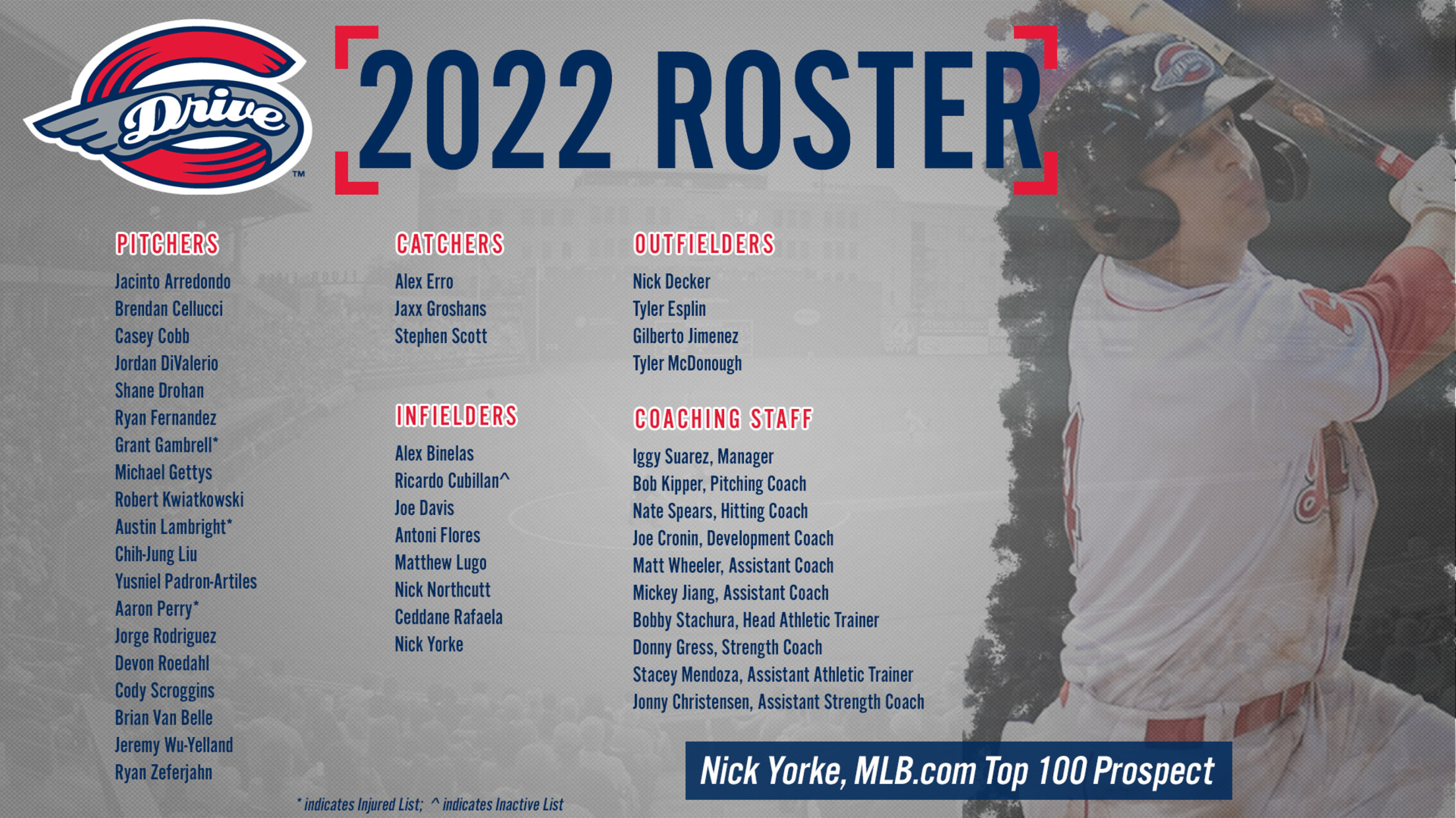 “The 2022 Greenville Drive roster is one that fans are really going to enjoy watching,” added Drive General Manager Eric Jarinko. “The pitching staff boasts a group that will be giving opposing batters fits all season, while the lineup features a lot of power.”