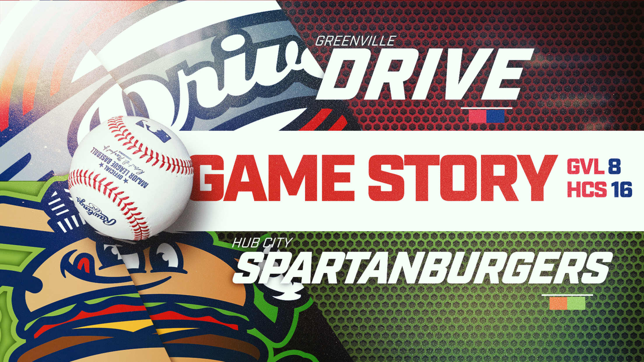 Hub City collected just 11 hits but capitalized on Drive mistakes and drew free passes to fuel their offensive explosion. Jones II and Dreiling combined for nine RBIs, and third baseman Gleider Figuereo added a homer, a double, and two RBIs for the Spartanburgers.