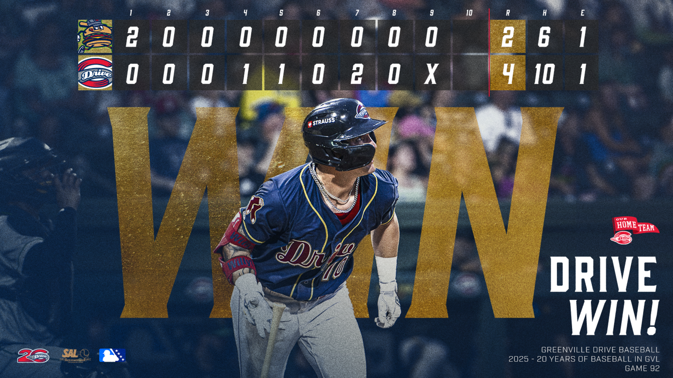 Trailing 2-0 after the first, Greenville (46-46) chipped away before erupting for two runs in the bottom of the seventh to secure their third win in the five-game set. With the victory, the Drive pulled even at .500 on the season and took a 3-1 lead in the series against the Spartanburgers (47-46).