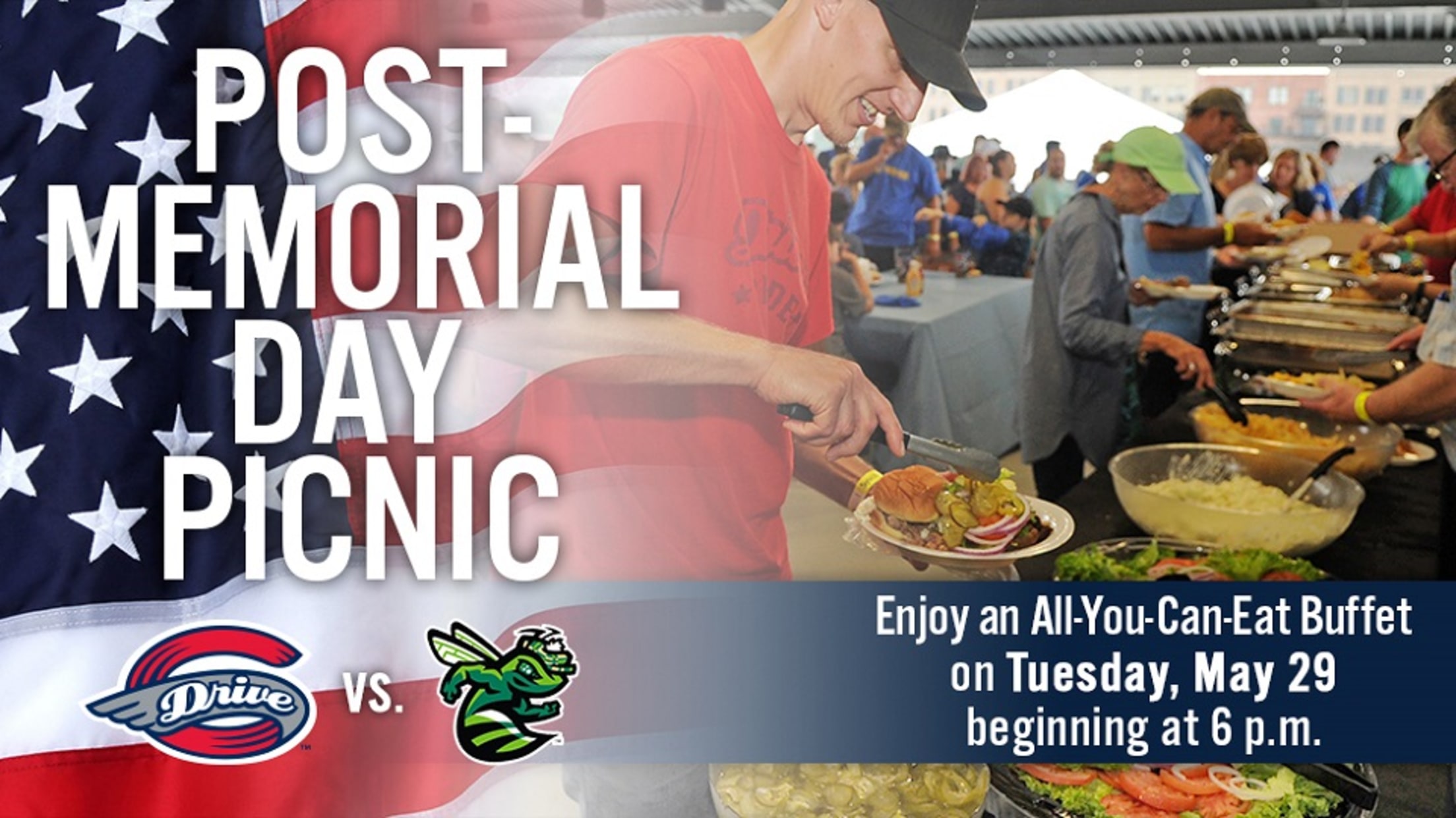 The Greenville Drive are on the road for Memorial Day, but you can come celebrate with us on Tuesday at Fluor Field with a special post-Memorial Day picnic!The all-you-can-eat buffet begins at 6:00 PM during the Drive's doubleheader against the Augusta GreenJackets, and runs until 7:30 PM. The picnic includes