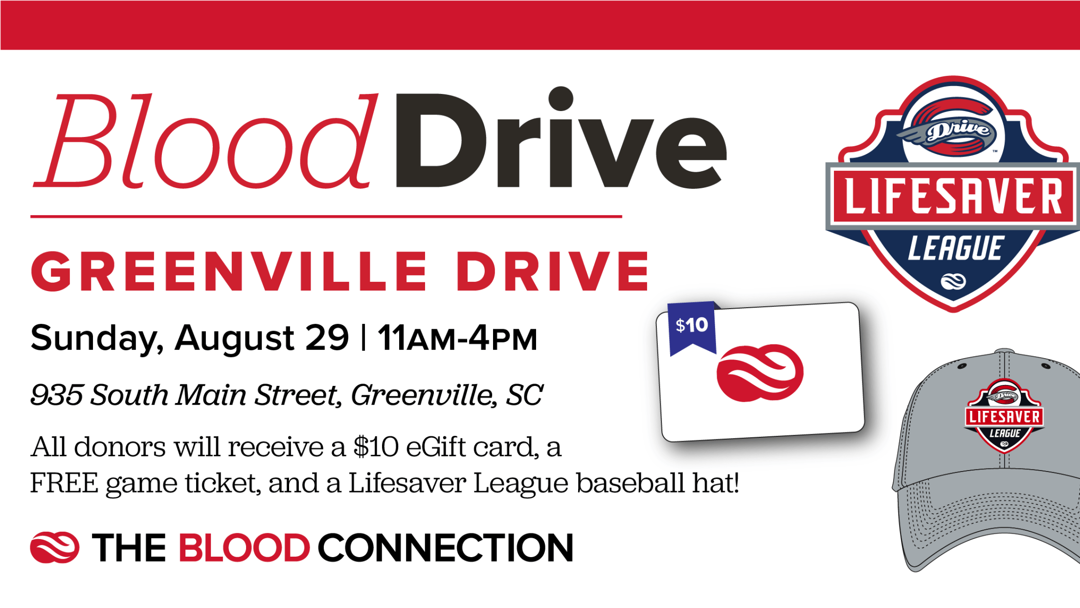 The Greenville Drive is proud to partner with the Blood Connection for another blood drive Sunday, August 29 at The Front Porch at Fluor Field, located at the corner of Field Street and Markley Street.