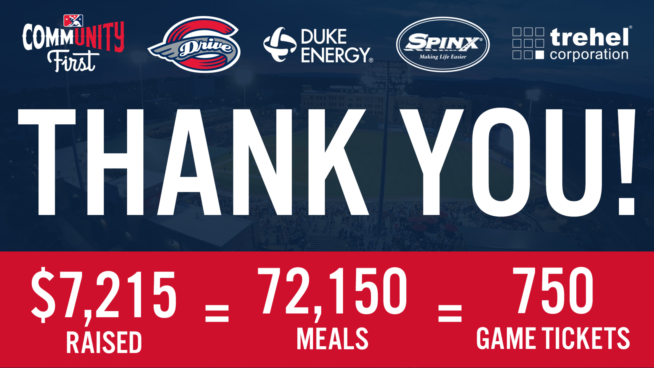 "We've always worked tirelessly in both good and challenging times to position the Drive as the 'Front Porch Of The Community' so it's a great privilege for us to take part in Minor League Baseball's CommUNITY First Campaign and give back to those who need it most," said Craig Brown, President and Owner of the Greenville Drive. "To raise the most funds across all of Minor League Baseball, and to do so with the great help of our long-time friends and partners at Trehel, Spinx, and Duke Energy, is humbling and speaks to the generosity and collaborative spirit of our partners and the Upstate community. COVID-19 has impacted nearly every aspect of daily life and we’re grateful for the help of our partners and the opportunity to use our platform to help those impacted the most."