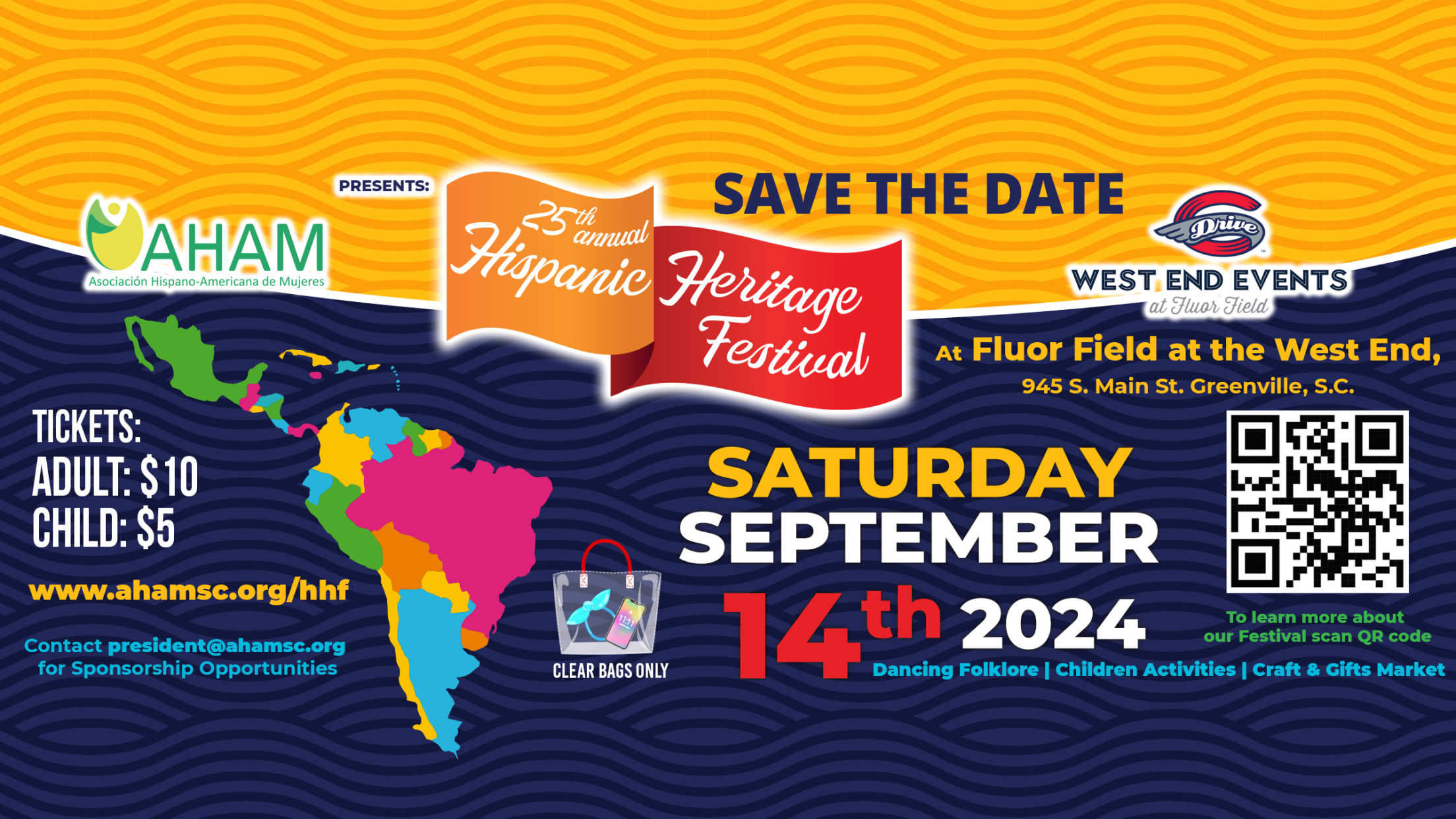 Join us for a fun filled day in the heart of Downtown Greenville! Get Tickets Here! AHAM, united for education for 26 years, proudly presents the Hispanic Heritage Festival. Don't miss this amazing celebration of culture and community! Children 4-years old and under enter for free. Immerse yourself in the