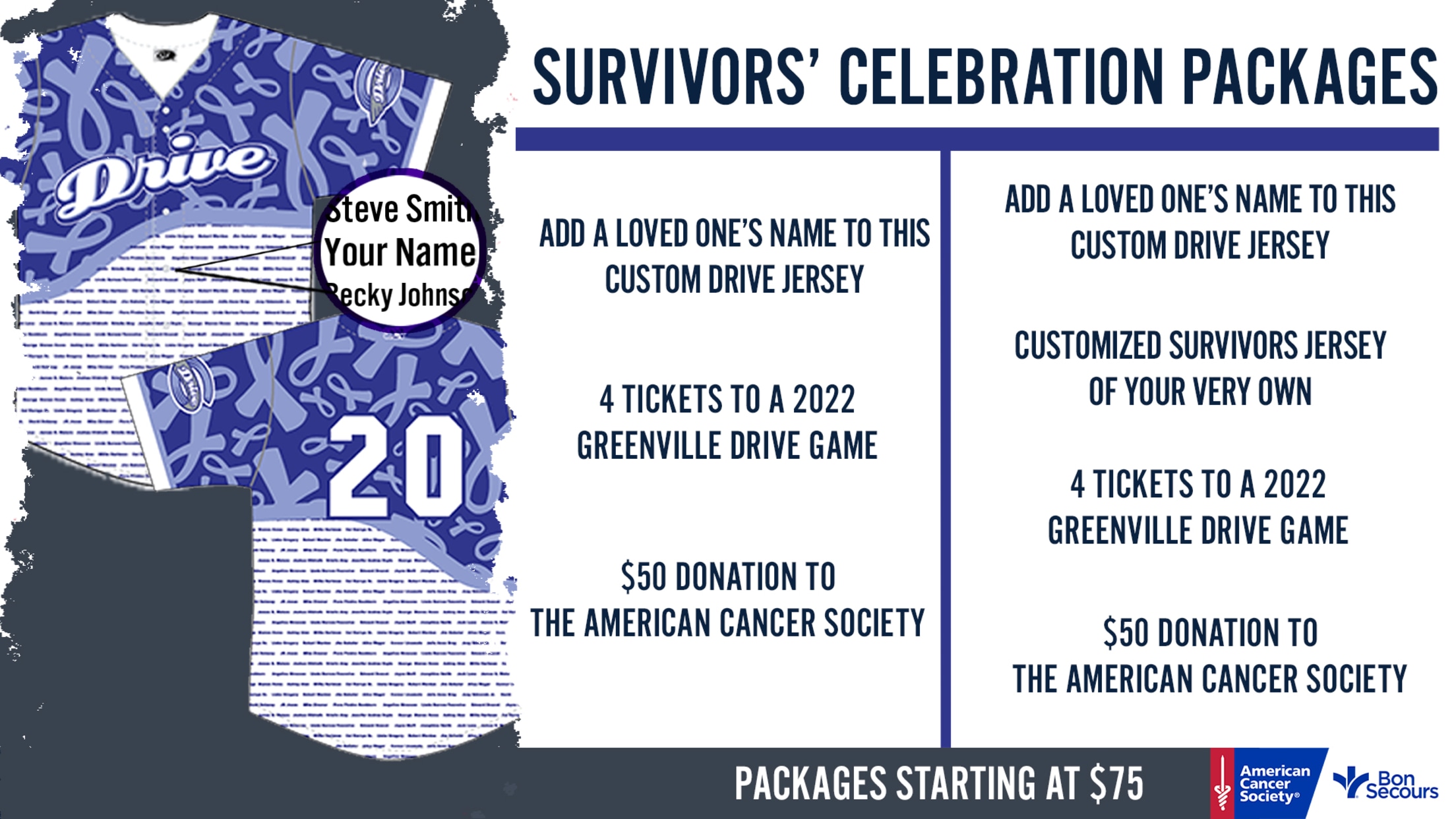 The Greenville Drive, along with Bon Secours and the American Cancer Society, will be creating a specially designed Survivors jersey to honor and celebrate those in our community affected by cancer. Packages are available for Drive fans to celebrate their loved one by including their name in the jersey design