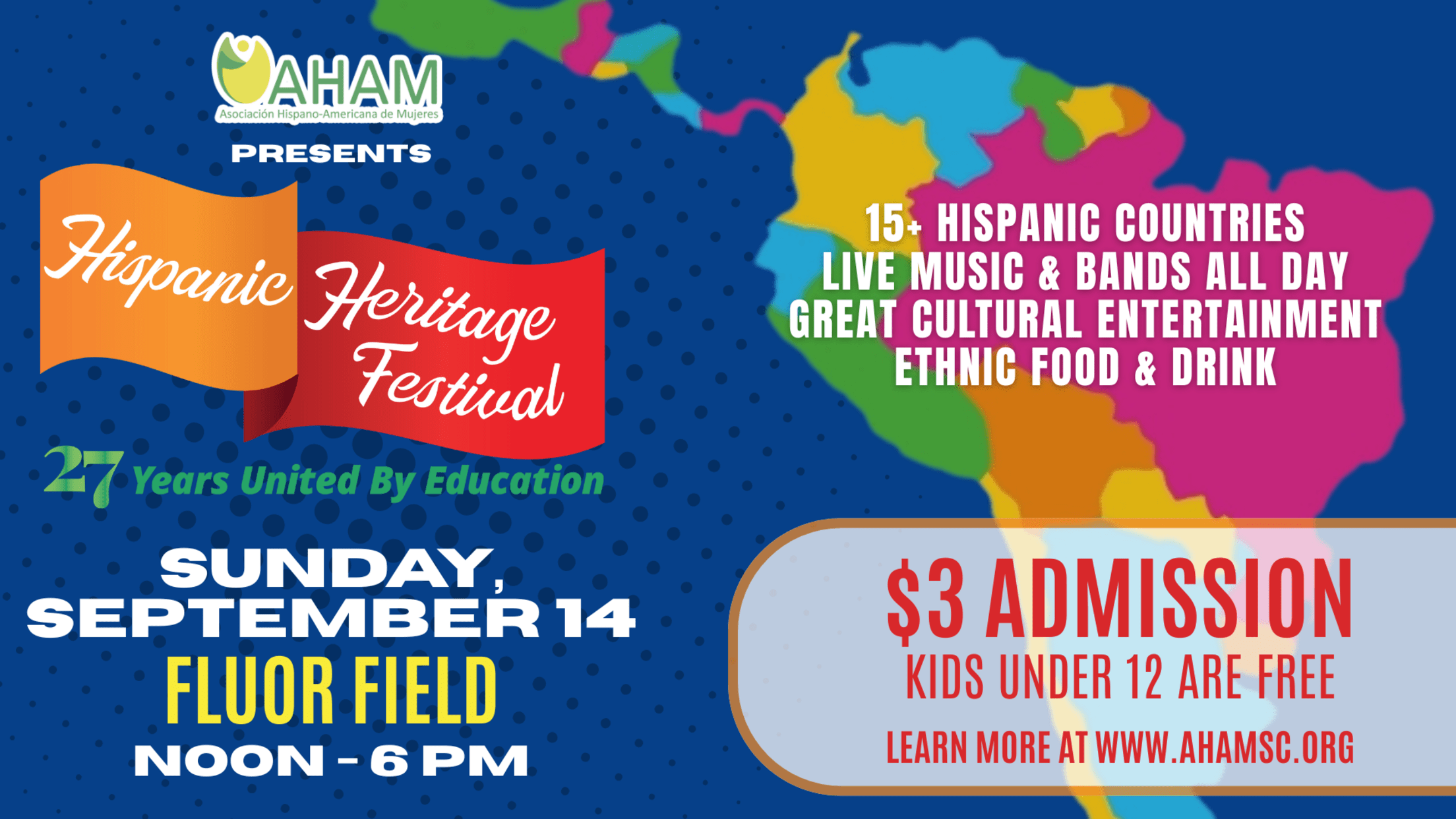 AHAM, united for education for 27 years, proudly presents the Hispanic Heritage Festival. Don't miss this amazing celebration of culture and community! Tickets are onl y $3 each and kids under 12 enter for free.