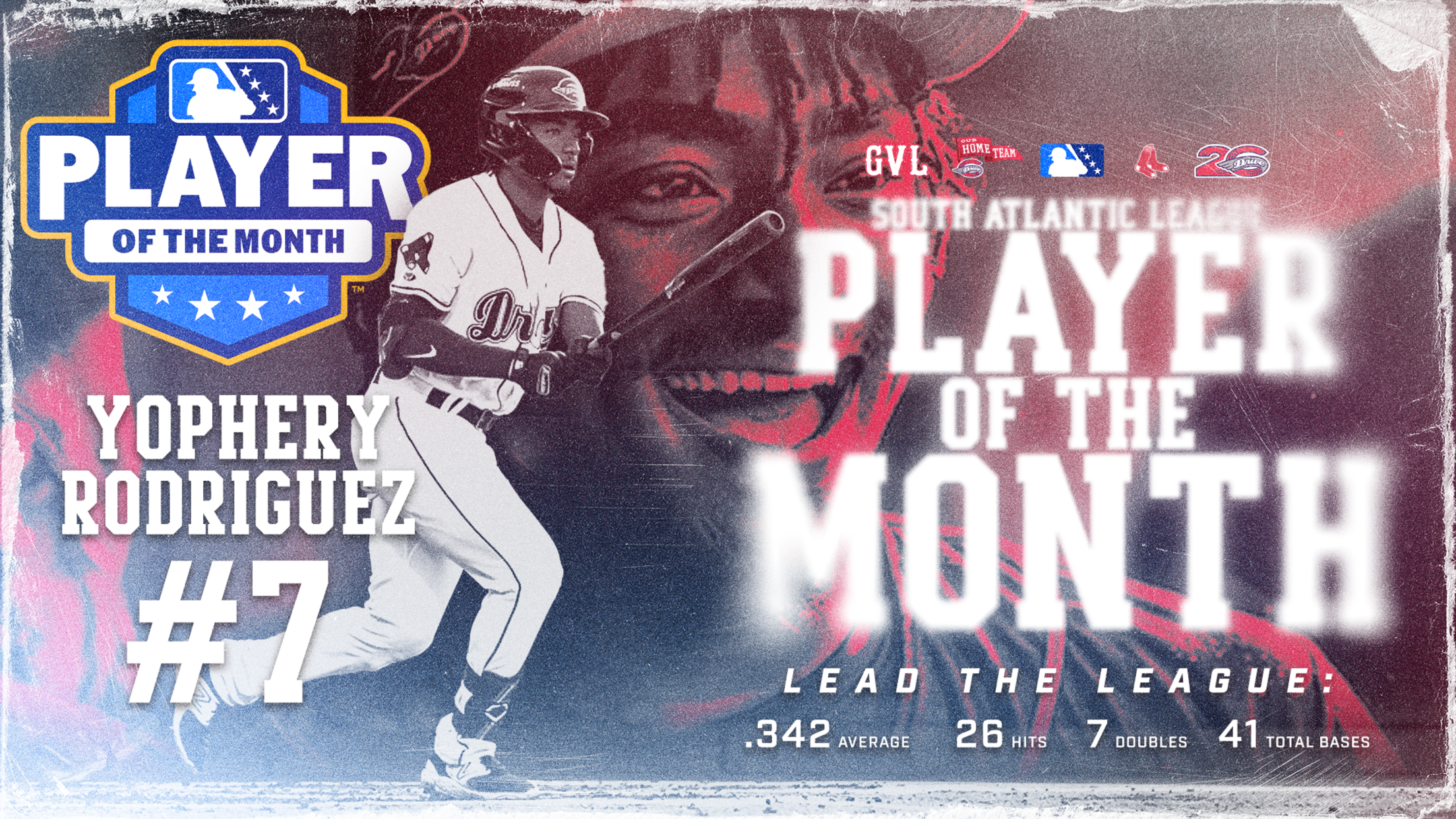 Yophery Rodriguez Earns July POTM Honors! Congratulations to the Drive Outfielder! Greenville Drive (Red Sox) outfielder Yophery Rodriguez batted .342/.375/.539 and led the league in average (.342), hits (26), doubles (seven) and total bases (41). He finished third in slugging percentage (.539) and OPS (.914) and was fifth in RBI