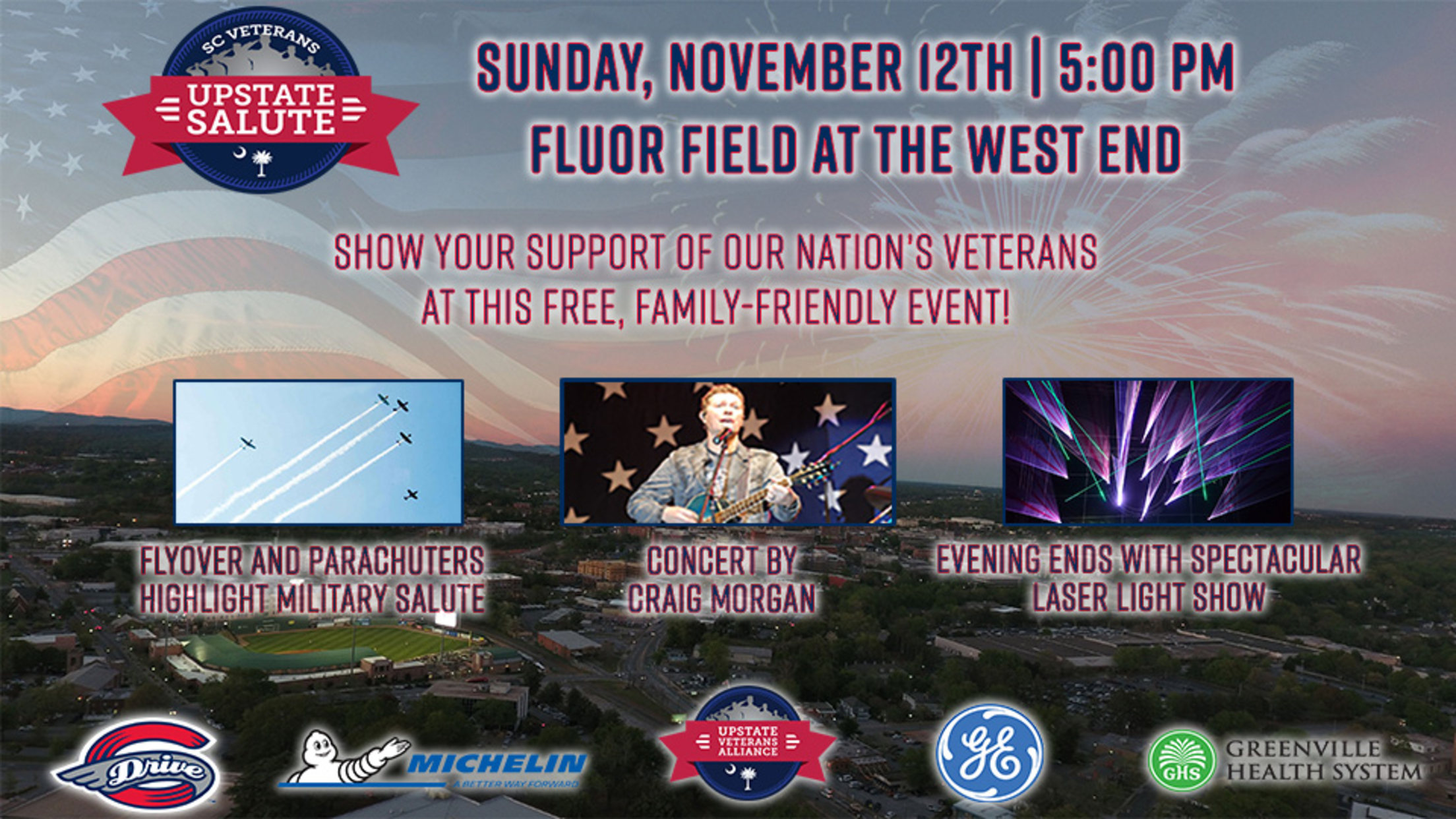 The Drive, along with fellow Upstate Veterans Alliance partners GE, Greenville Health System and Michelin are excited to team up for the second annual SC Veterans Upstate Salute! You're invited to join us in this free celebration on Sunday, November 12th at Fluor Field, as we will honor our local veterans with a night full of entertainment.