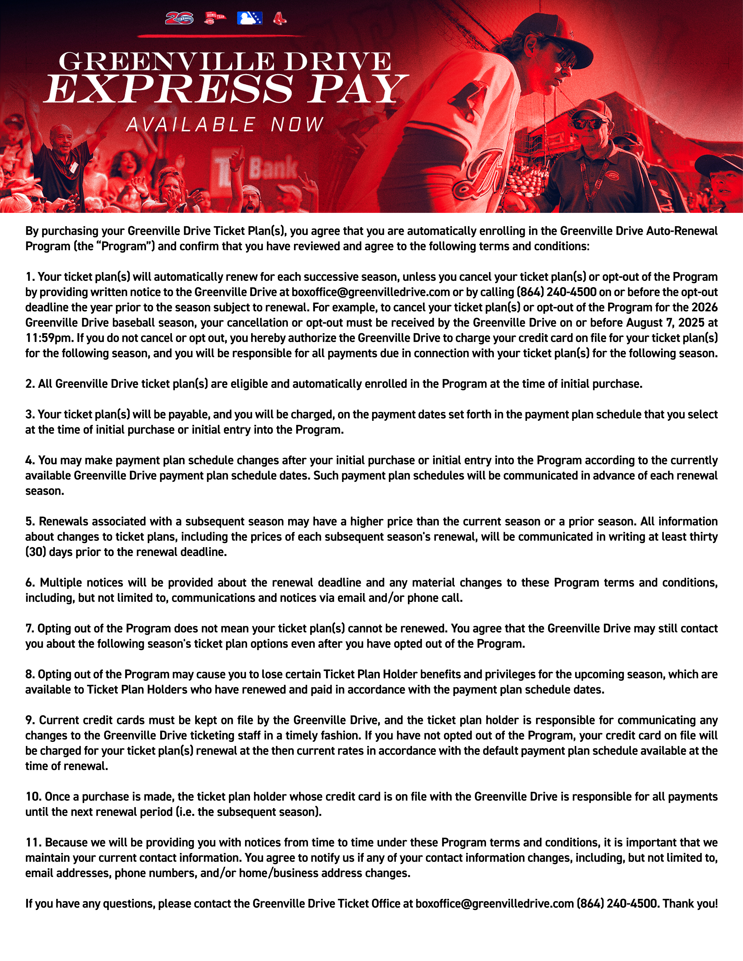 Your card will be automatically charged for the full amount of your tickets plan by the Greenville Drive on each season’s designated first payment date (8/11).