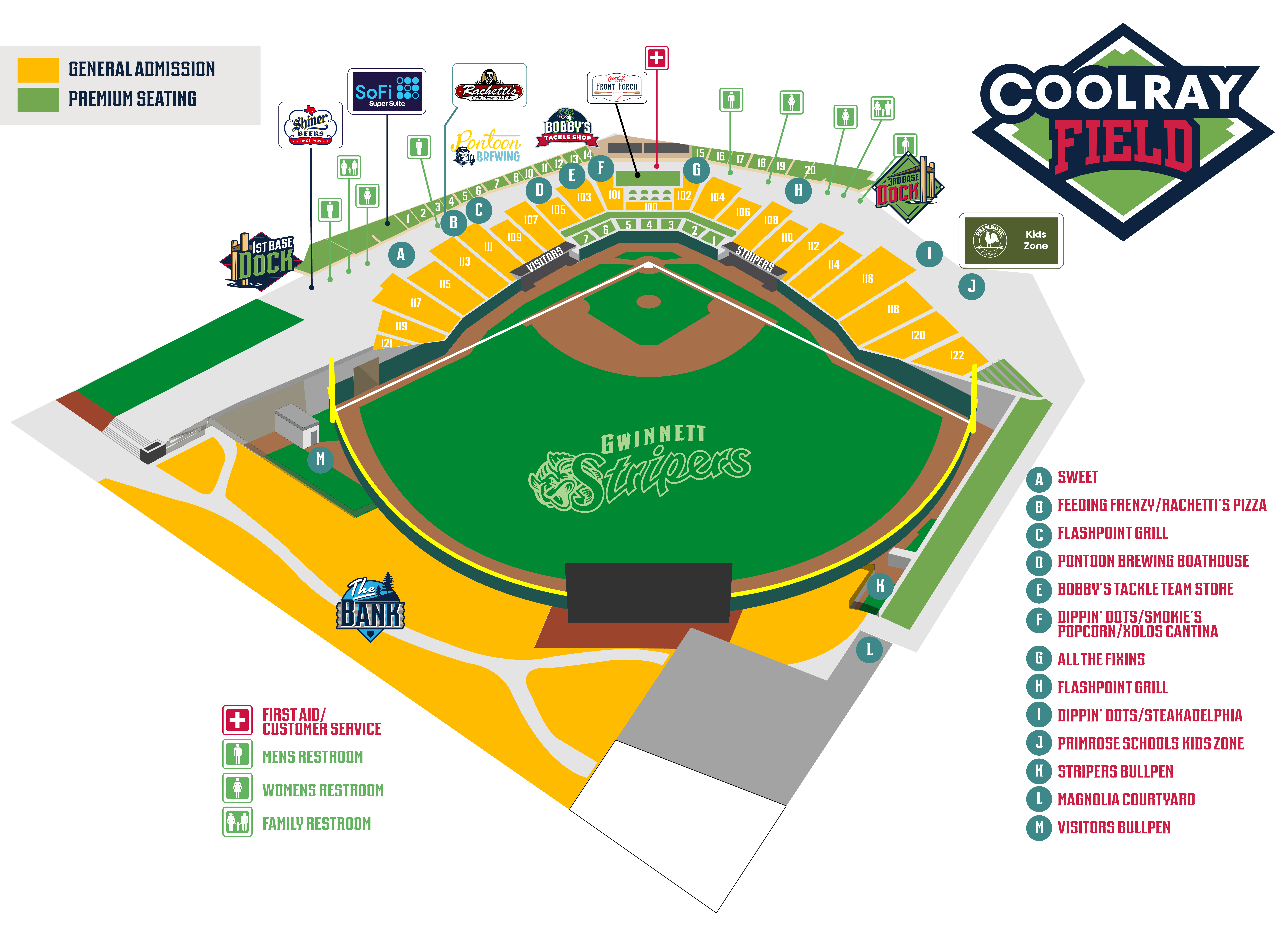 - Elevator: An elevator is located on the main concourse at Section 102 for wheelchair access to the Cutwater Club and Suite Level of Coolray Field.