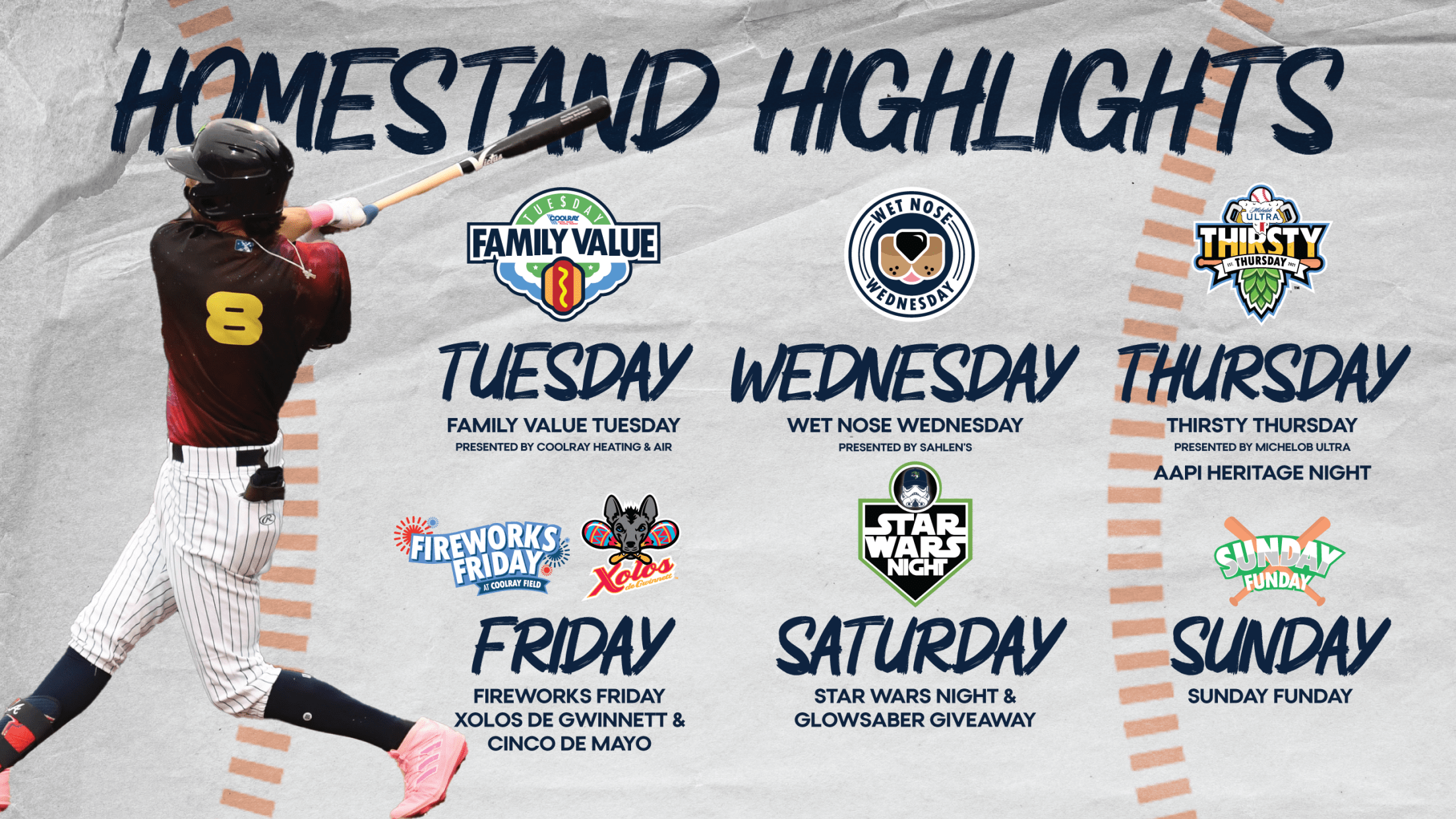 The Stripers will also celebrate the contributions of Asian-American and Pacific Islanders with AAPI Heritage Night on Michelob Ultra Thirsty Thursday. The homestand continues with a packed three-promotion night on Friday with Cinco de Mayo, Fireworks Friday, and another Xolos de Gwinnett night.