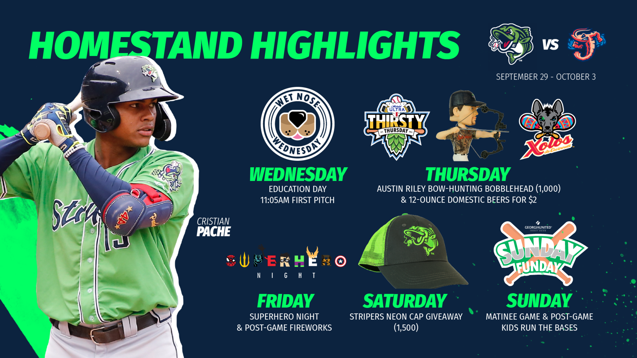 LAWRENCEVILLE, Ga. – The Gwinnett Stripers host the Jacksonville Jumbo Shrimp (Triple-A, Miami Marlins) at Coolray Field for a five-game series from September 29-October 3. The Stripers’ final homestand of 2021 includes a second Austin Riley “Bow-Hunting” Bobblehead Giveaway on September 30, Superhero Night on October 1, and a Stripers Neon Cap Giveaway on October 2.