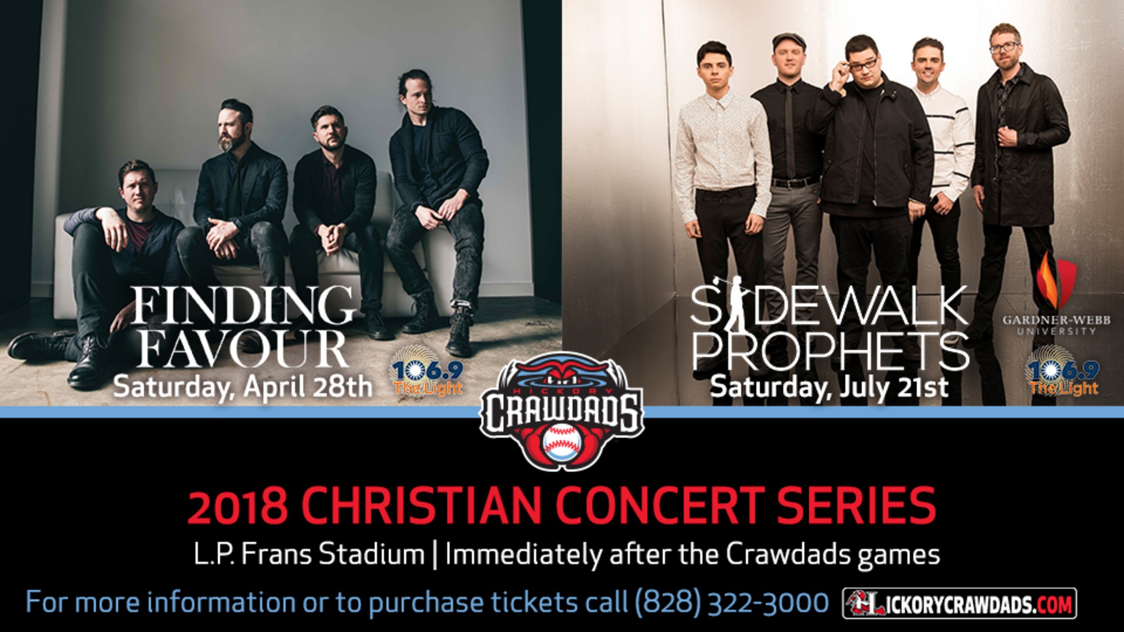 The Hickory Crawdads are bringing back their annual Christian Concerts in 2018. Finding Favour, presented by 106.9 The Light, will play following the Crawdads game on April 28th. The Sidewalk Prophets, presented by Gardner-Webb University and 106.9 The Light, will headline the post-game concert on July 21st. The games on