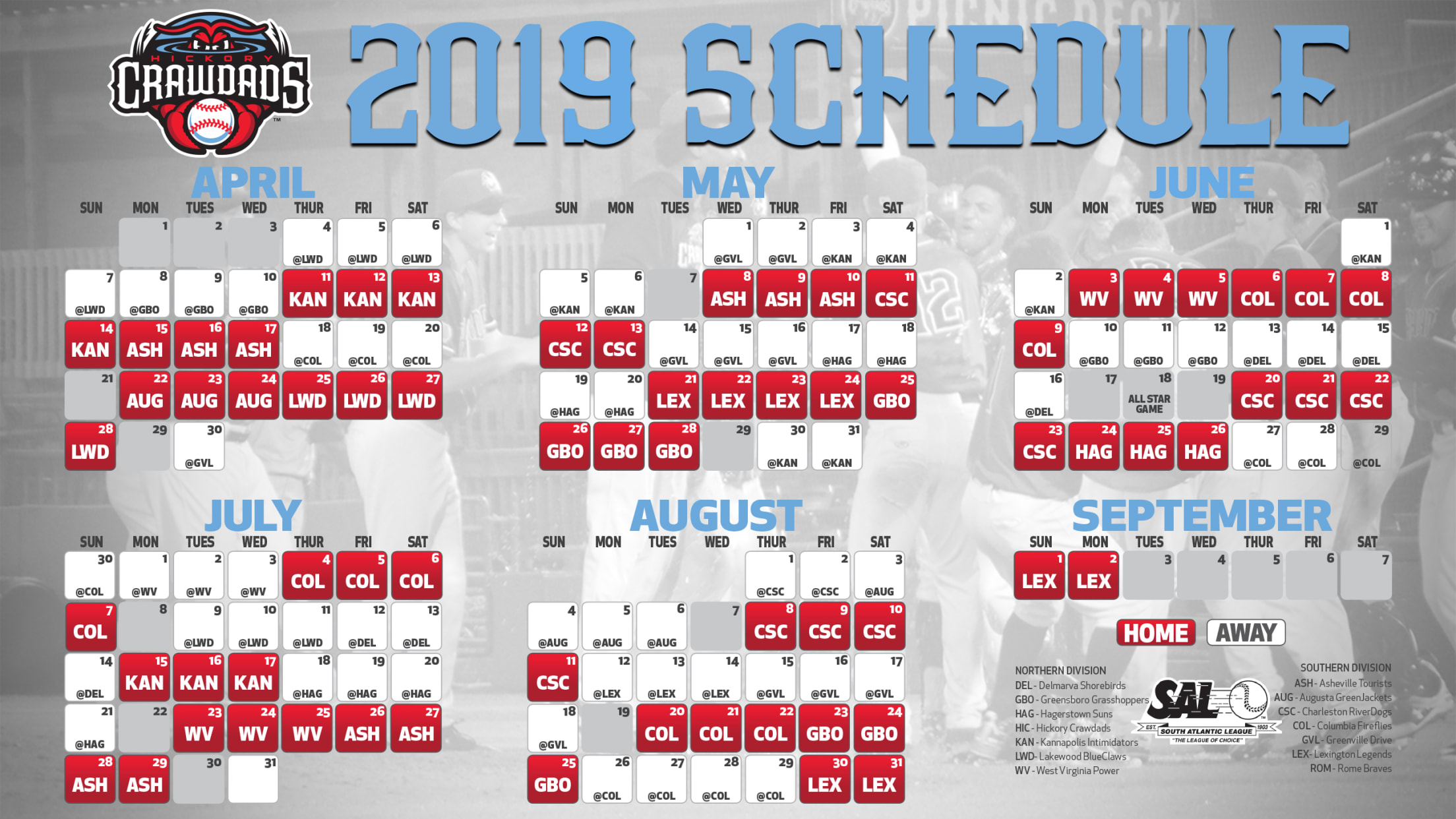 Hickory, NC- The Crawdads have released their 2019 season schedule, with the season is slated to start on the road on Thursday, April 4th in Lakewood. The home opener is set for Thursday, April 11th against the Kannapolis Intimidators.