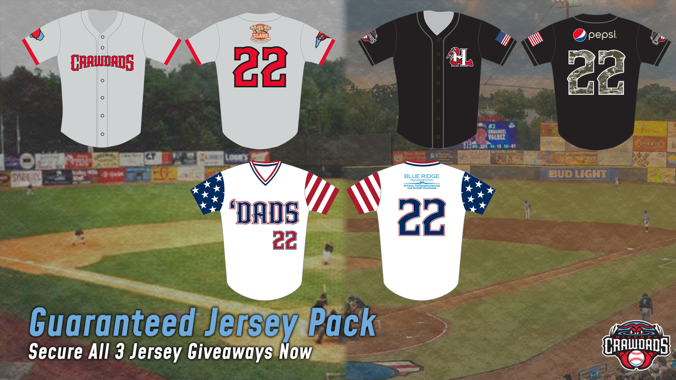 Hickory, NC- The Crawdads are excited to announce a trio of jersey giveaways for the 2022 season. The first giveaway, sponsored by 3 Labs Property Inspection, will be on Saturday, April 16th and will be a replica of the new road jerseys the ‘Dads are debuting this year. The second, will be a military themed jersey given away on Saturday, May 28th thanks to Pepsi. The final jersey giveaway is a patriotic themed jersey that will be given away on Saturday, July 2nd courtesy of Blue Ridge Transportation.