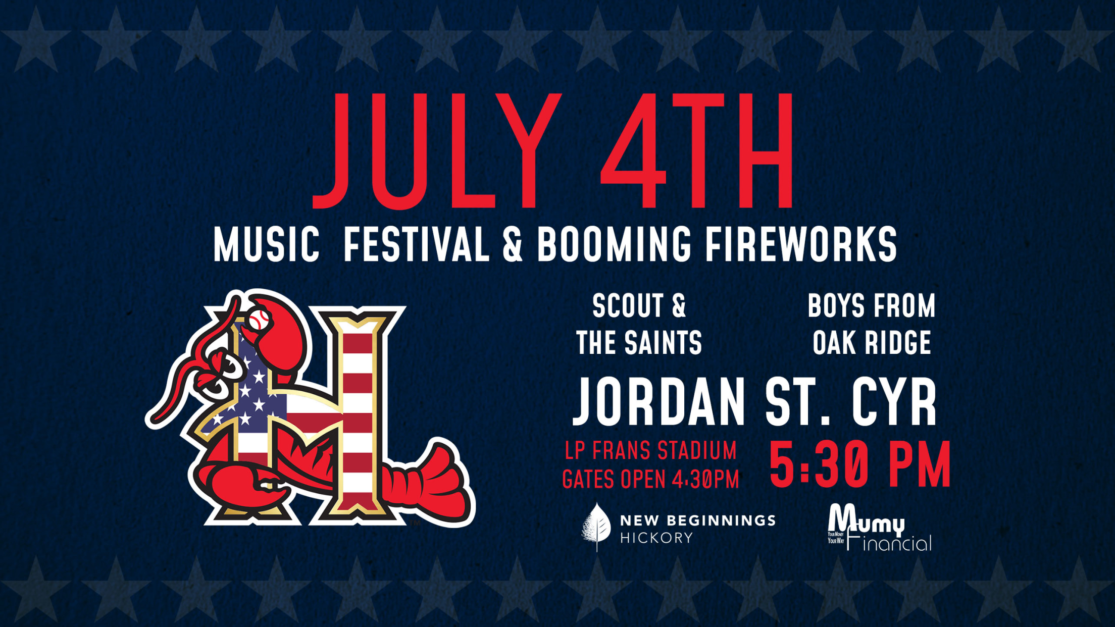 Hickory, NC- The Crawdads are excited to announce a July 4th Music Festival and Firework Show, presented by Mumy Financial and New Beginnings Hickory, in celebration of America’s 250th birthday.