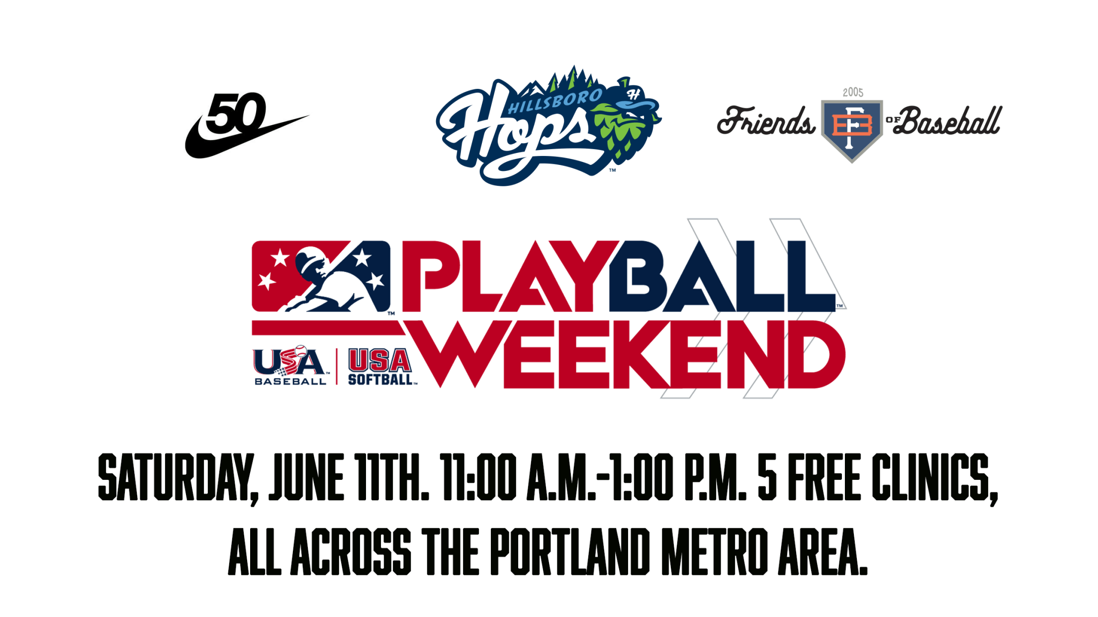 Hillsboro, OR. (May 27, 2022) - The Hillsboro Hops (@HillsboroHops) have partnered with Nike and Friends of Baseball to offer five (5) FREE youth clinics all around the Portland metro area on Saturday, June 11th in 2022. On Sunday June 12th, the Hops will have a pre-game catch on Ron
