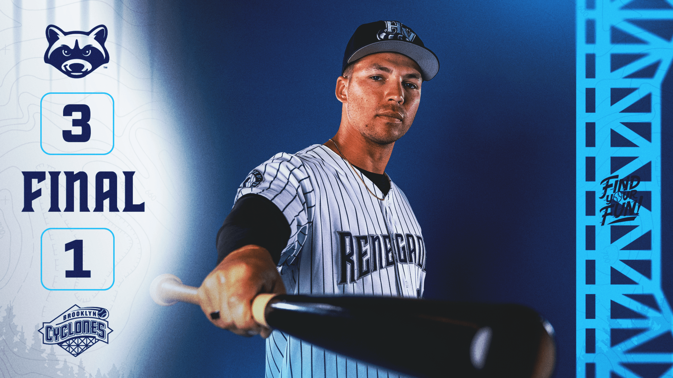 Brooklyn, NY (April 3, 2026) -- The Hudson Valley Renegades defeated the Brooklyn Cyclones 3-1 on Friday night at Maimonides Park on Opening Night of the 2026 season. The Renegades won their first Opening Night game since April 7, 2023 vs Greensboro Grasshoppers, an 8-1 win at Heritage Financial Park.