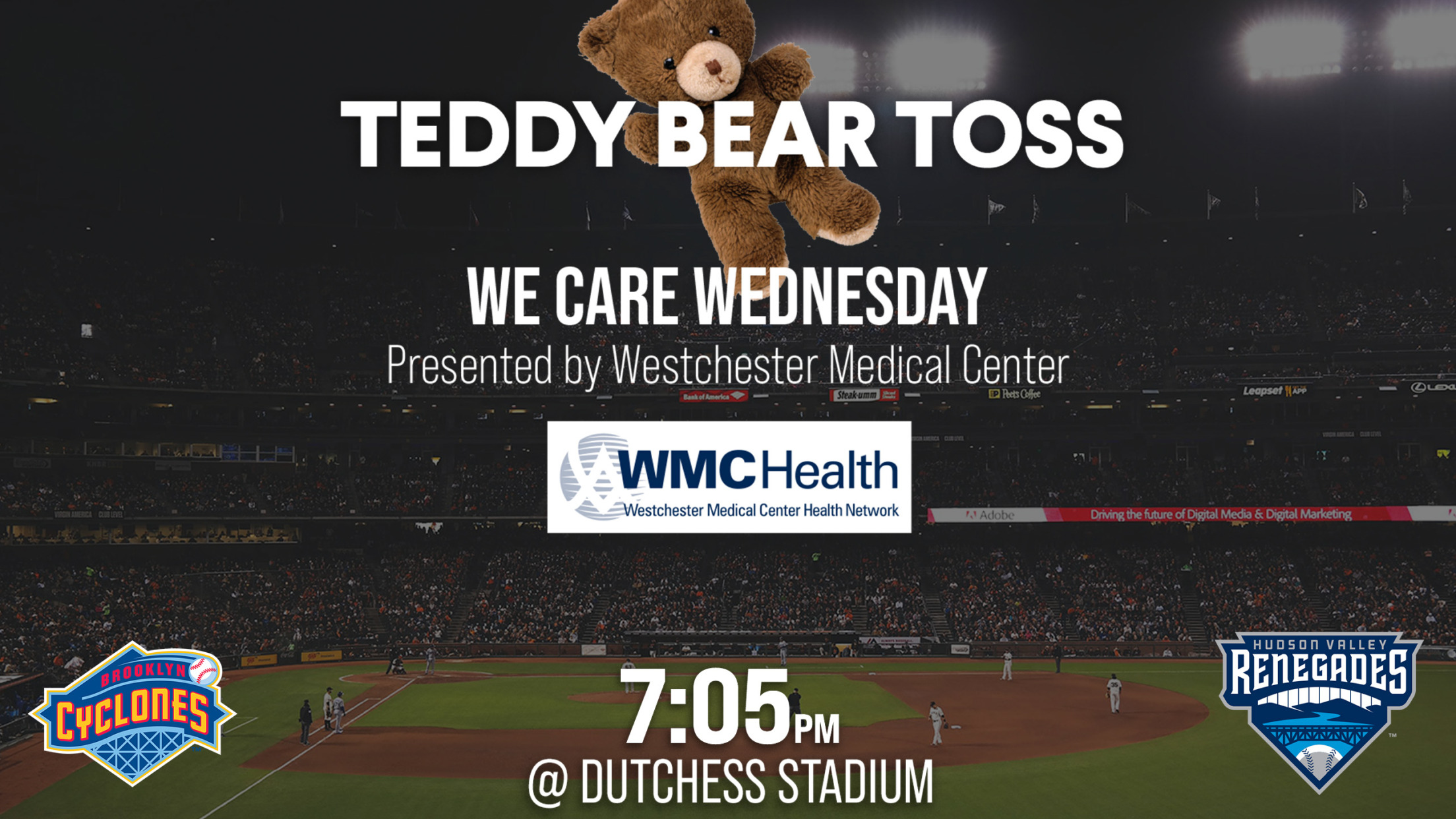 Wappingers Falls, N.Y. (July 22, 2022) –The Hudson Valley Renegades will be hosting a Teddy Bear Toss at Dutchess Stadium on Wednesday, July 27 immediately following that night’s game against the Brooklyn Cyclones. The event is part of the We Care Wednesday program, presented by Westchester Medical Center Health Network (WMCHealth).