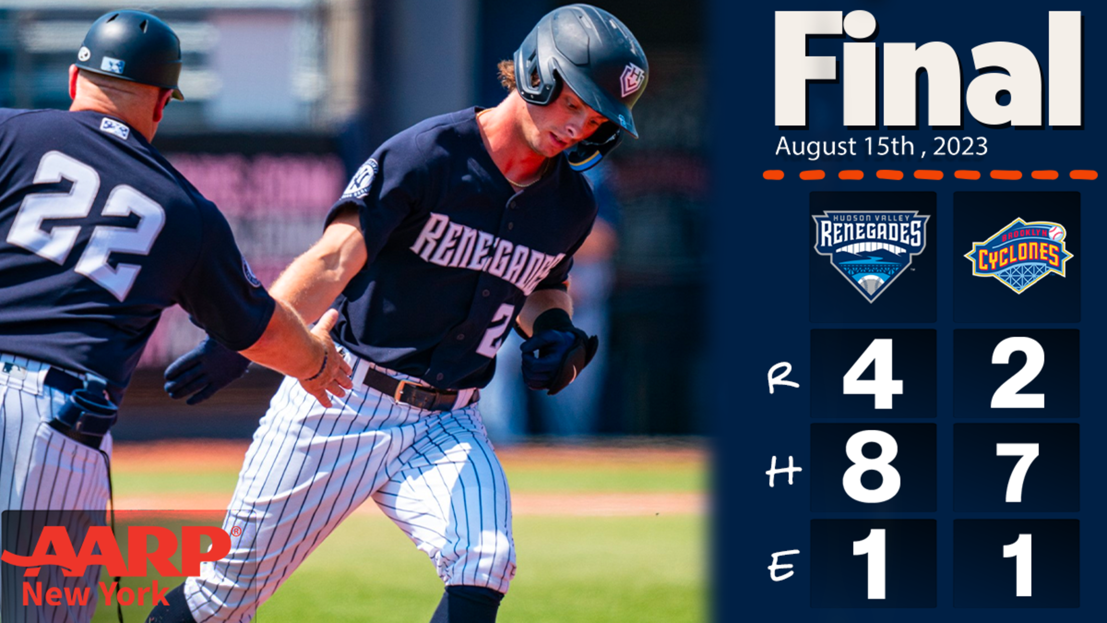 Brooklyn, N.Y. (Aug. 15, 2023) — The Hudson Valley Renegades took the series opener against the Brooklyn Cyclones 4-2 on Tuesday night at Maimonides Park.
