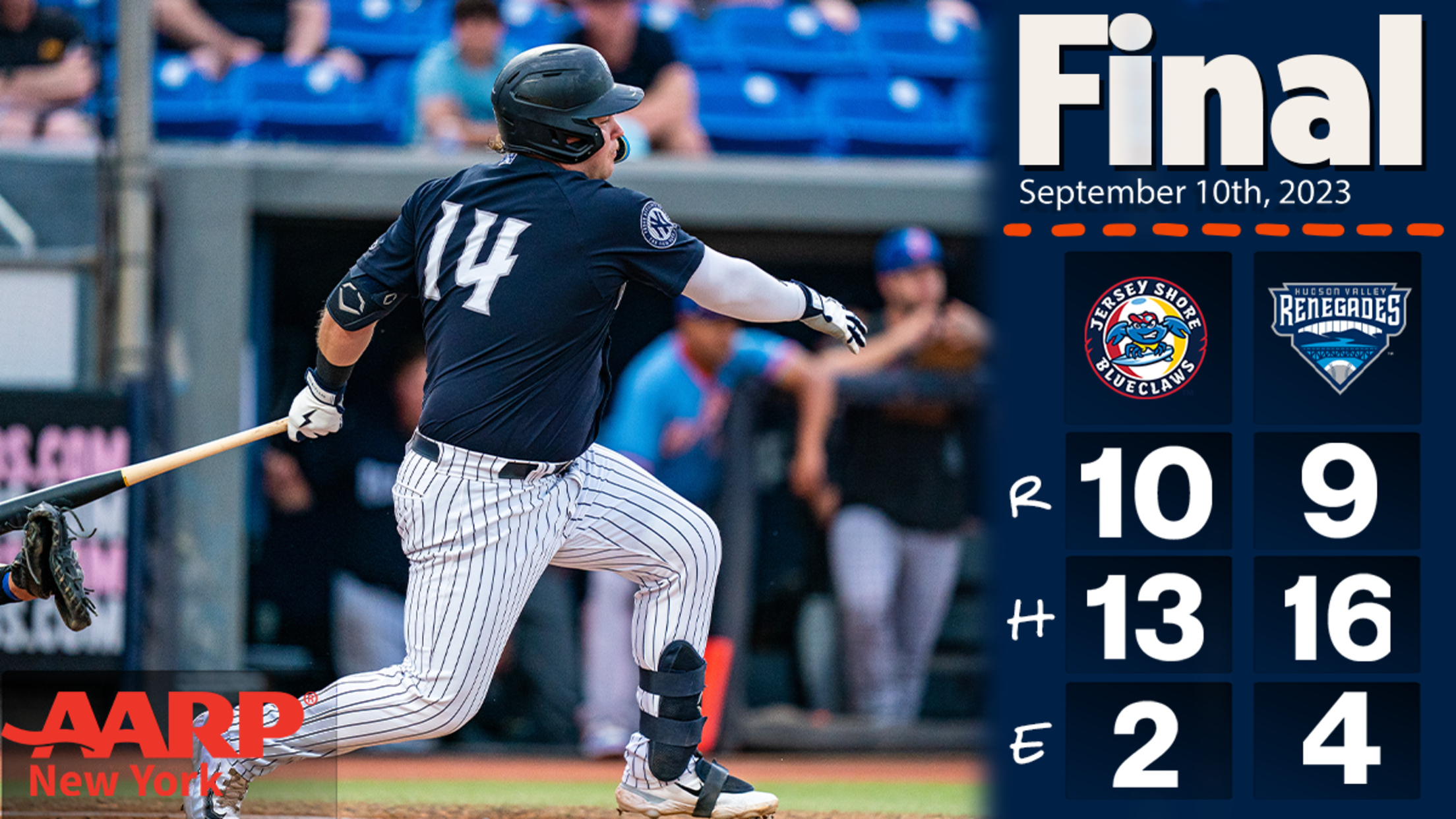 Wappingers Falls, N.Y. (Sept. 10, 2023) — The Jersey Shore BlueClaws squeaked past the Hudson Valley Renegades 10-9 in 11 innings on Sunday afternoon at Heritage Financial Park to close out the 2023 regular season. With the victory and a loss by the Brooklyn Cyclones, the BlueClaws won the Second Half Championship in the North Division of the South Atlantic League and secured a playoff spot.