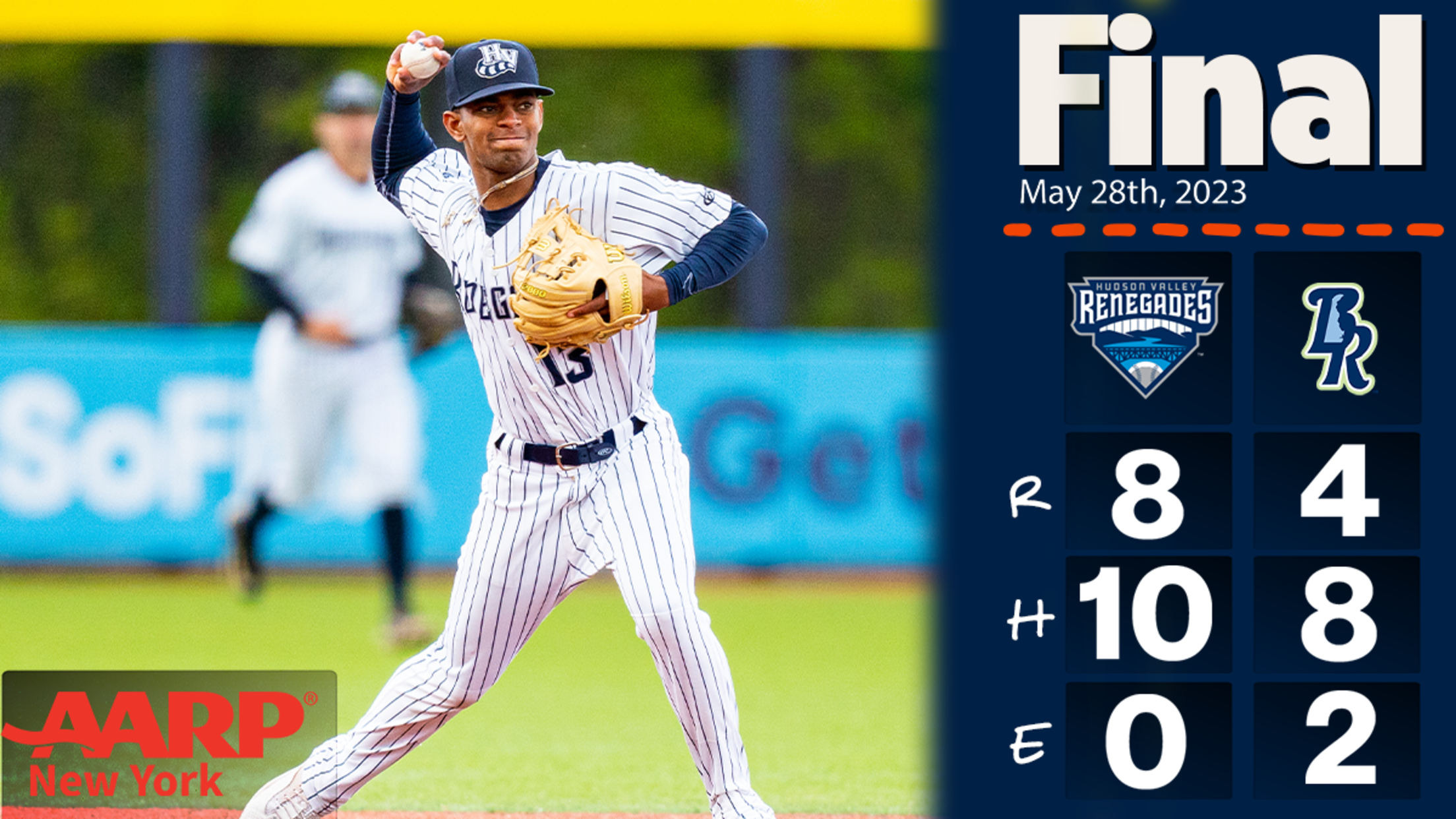 Wilmington, Del. (May 28, 2023) — Early offense propelled the Hudson Valley Renegades to an 8-4 win over the Wilmington Blue Rocks on Sunday night at Frawley Stadium. With the win, Hudson Valley won the series from Wilmington, its fifth series win in seven six-game series this season. The Renegades